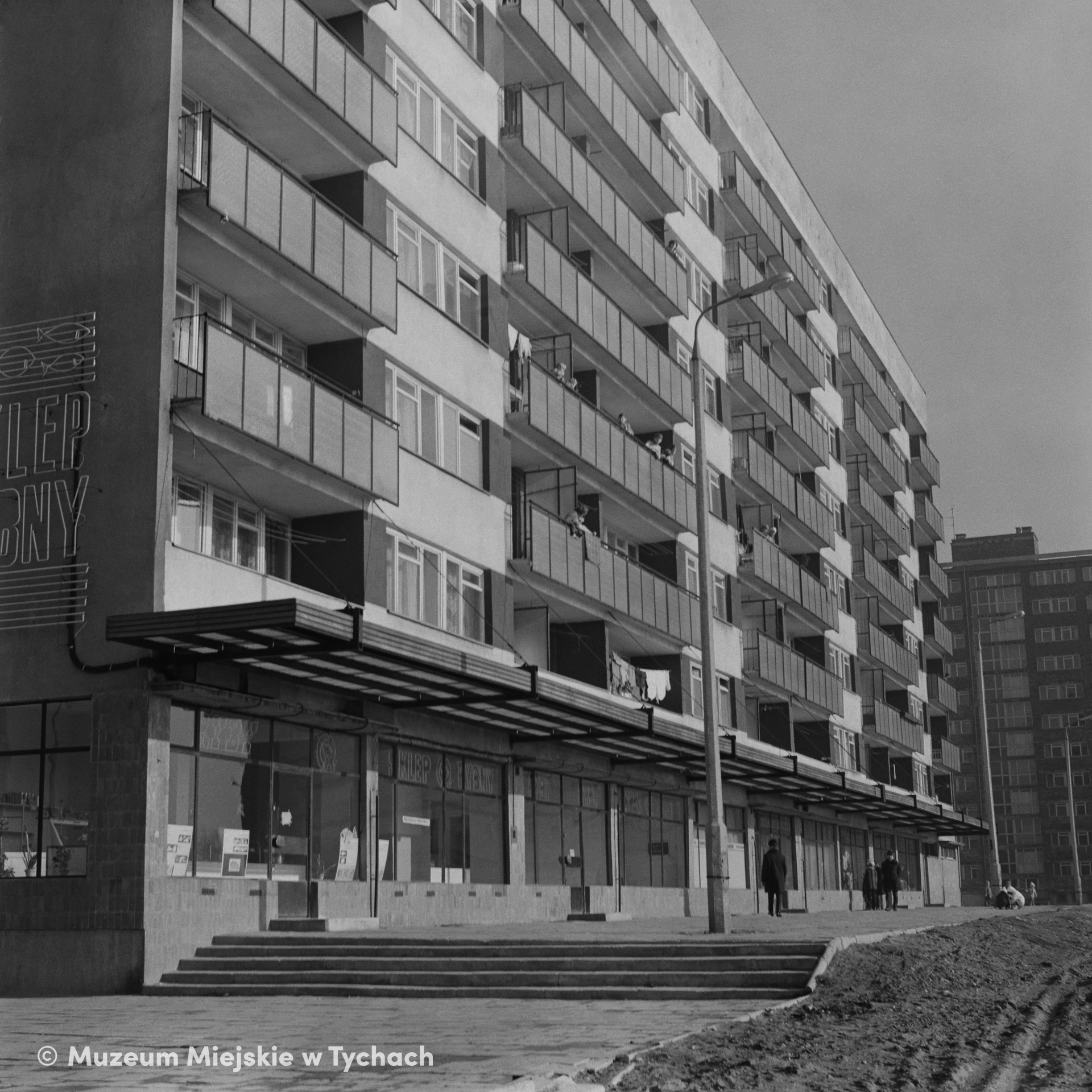 A residential building in Karola Darwina Street with shops and service establishments on the ground floor. The gable wall of the building bears a neon sign of a fish shop on . Featured in the background is a residential block in Jarosława Dąbrowskiego Street (now Henryka Dąbrowskiego Street).