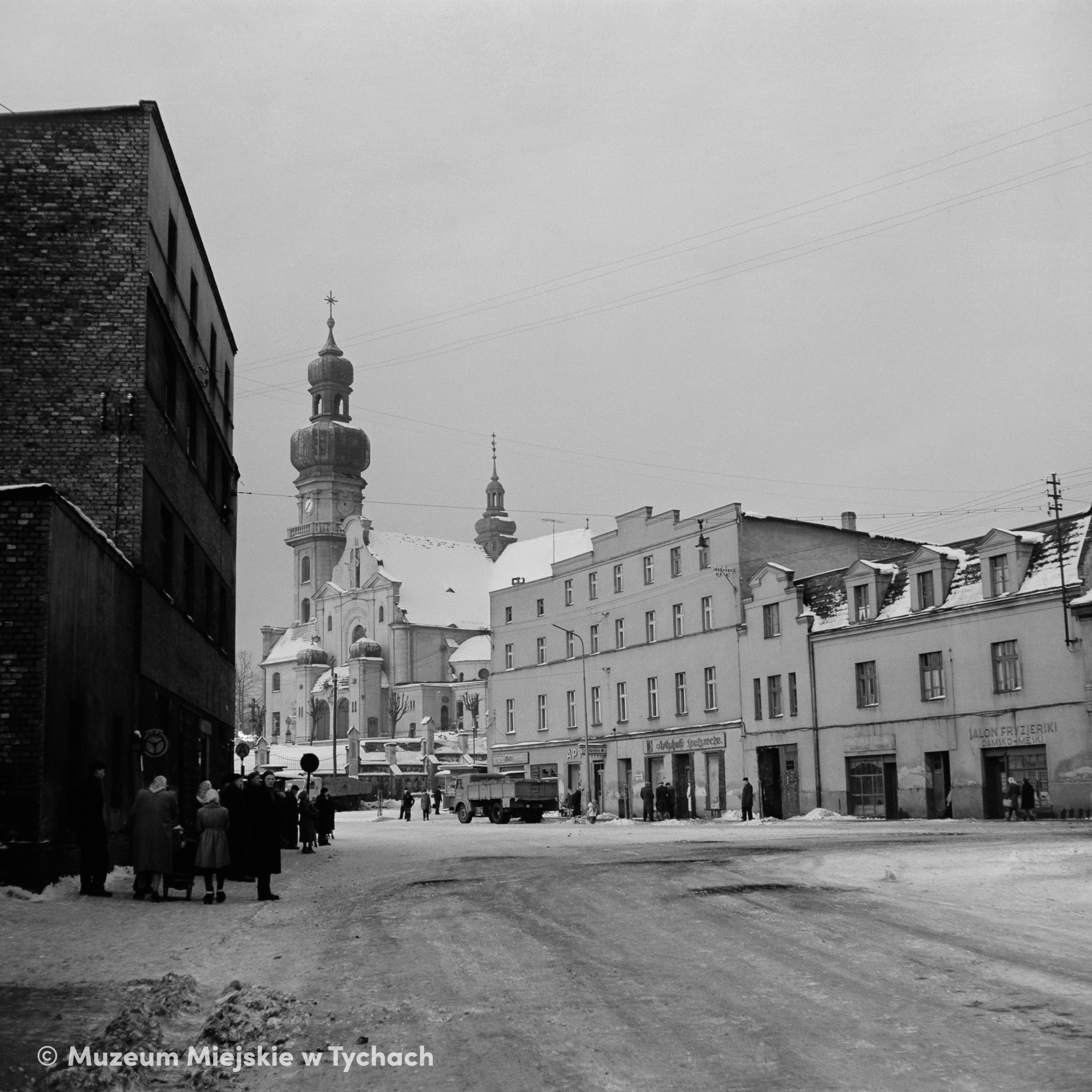 A view of the 18th century St. Mary Magdalene's Church and a fragment of Tychy's oldest developments. On the pavement, a group of people waits at a bus stop. Photo taken in winter.