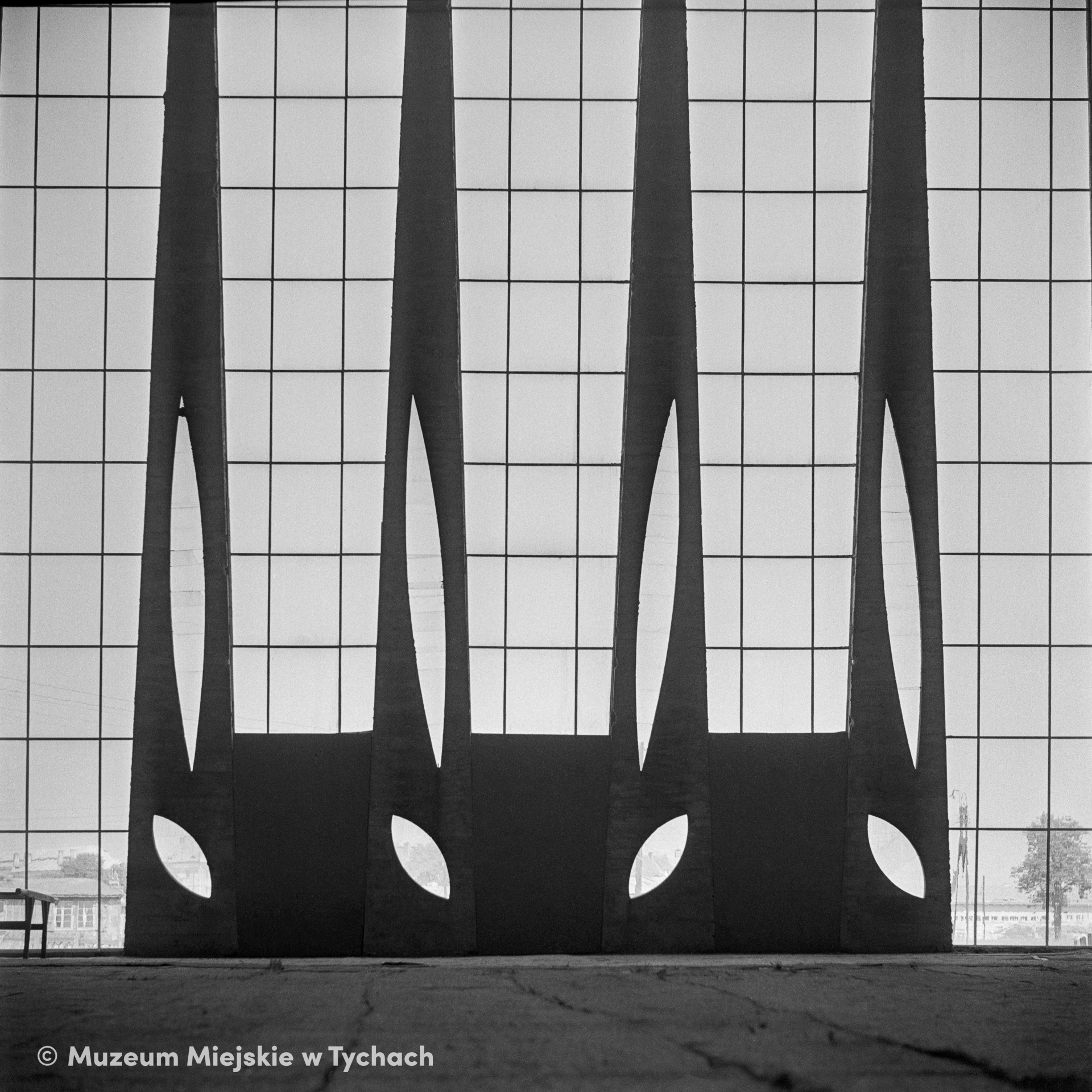 A fragment of concrete floor and the front wall with entrances to St. John the Baptist's Church. The characteristic concrete structure of the wall is glazed.