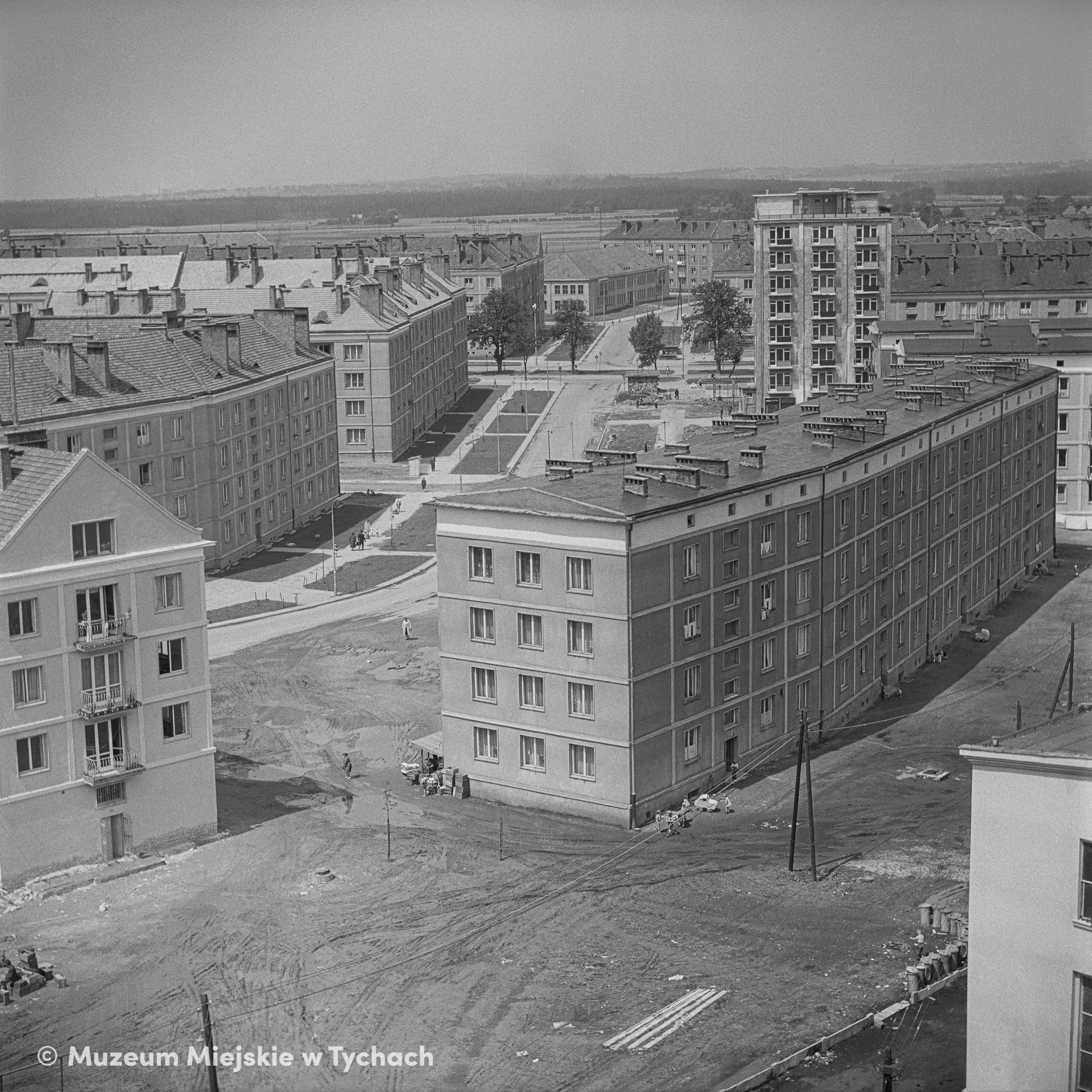 A view from the courtyard of residential locks in Cyganerii Street. Visible between the buildings is a fragment of Cyganerii Street and its intersecction with Bielska Avenue, followed by a section of Stefana Czarnieckiego Street. The area of the courtyard is unmaintained and muddy. At the corner of the building, there is a makeshift vegetable stall. Pictured in the background are residential blocks and Primary School No. 5, with a fragment of a local boiler house on the right.