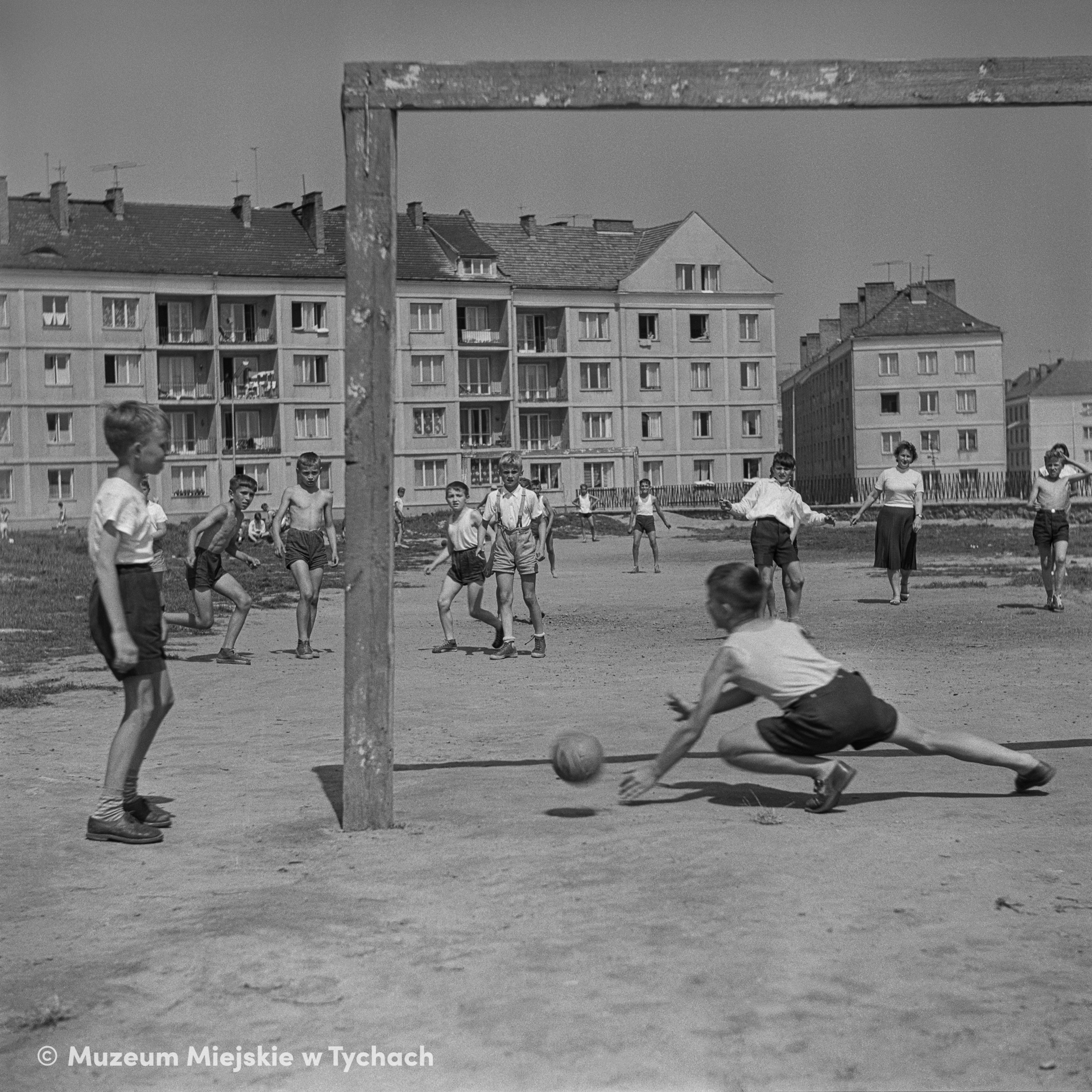A makeshift football pitch in Czysta Street, next to Primary School No. 11. Pupils play football supervised by teacher Maria Kościańczuk. The back groundfeatures residential blocks in Housing Estate C.