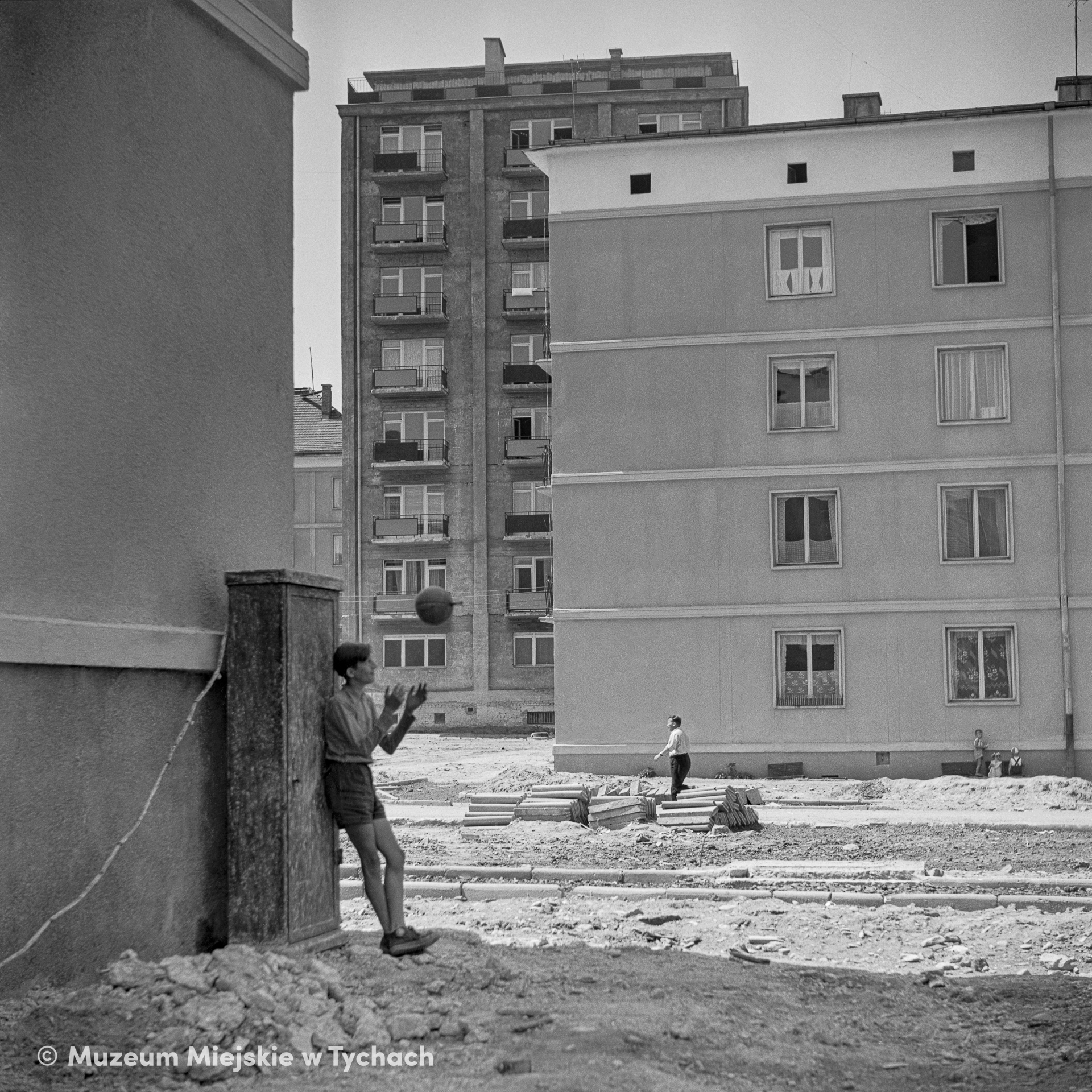 Residential blocks in Ciasna Street. A boy with raised arms leans against a free-standing power distribution cabinet at the gable wall of a building. An unmaintained area with remnants of a building site spreads all around. The building on the other side of the street, in the courtyard, is a single-entrance block addressed as 81 Bielska Avenue.