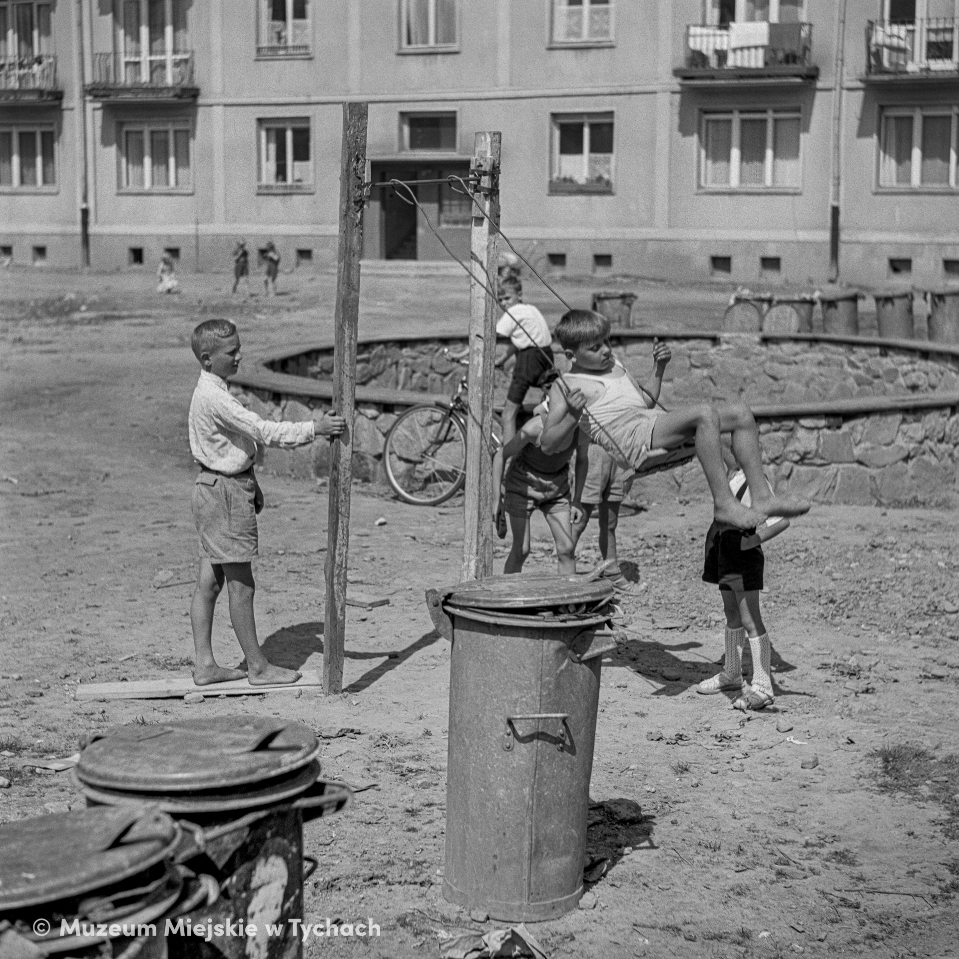 A courtyard in front of a residential building in Paprocańska Street (Rewolucji Październikowej from 1968, now Niepodległości Avenue) with a small, round stone wall in the middle. Boys play on a makeshift swing in an unmaintained area, with waste bins standing randomly around. In the background there is a fragment of a residential block with a staircase entrance visible.