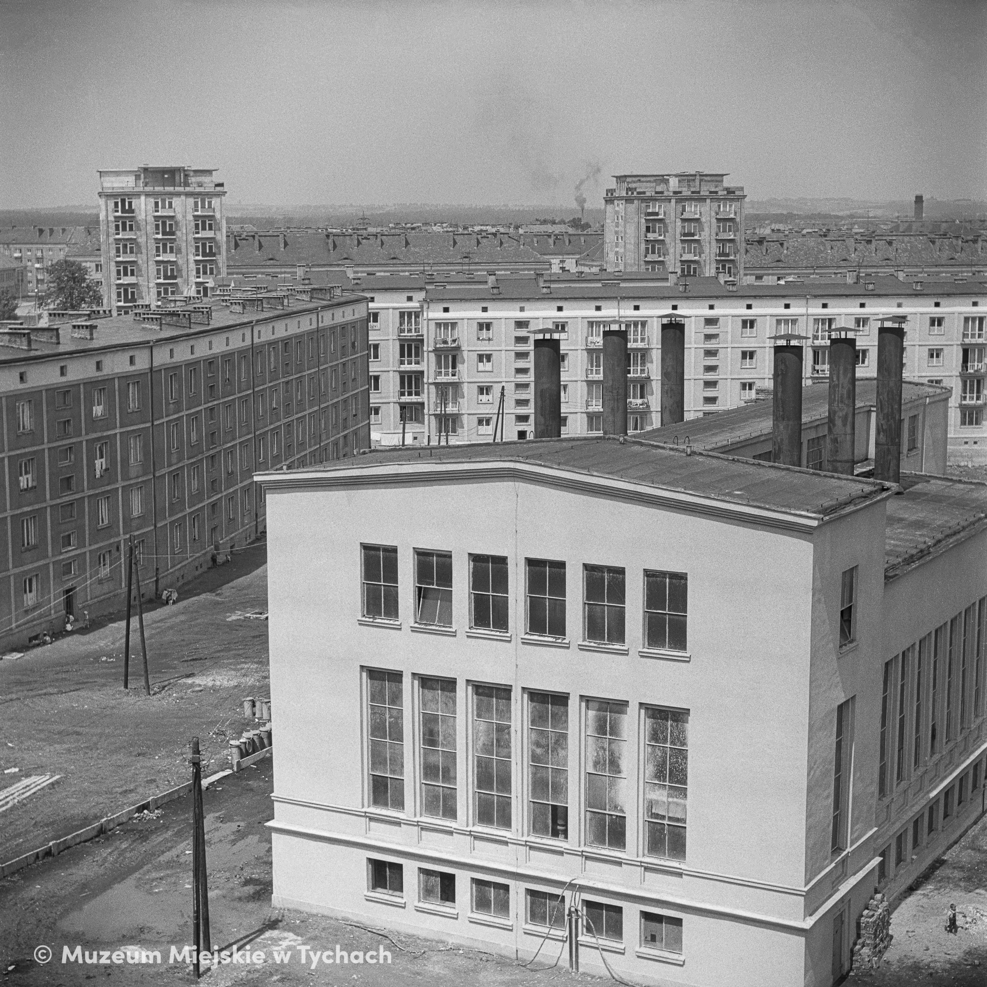 A view from the south of the local boiler house, providing central heating for the connected buildings of the estate. The boiler house is sitated in the inner part of Housing Estate C2, among the residential blocks of Cyganerii, Ciasna, Czysta and Paprocańska streets (Rewolucji Październikowej Ave. from 1968, now Niepodległości Avenue).