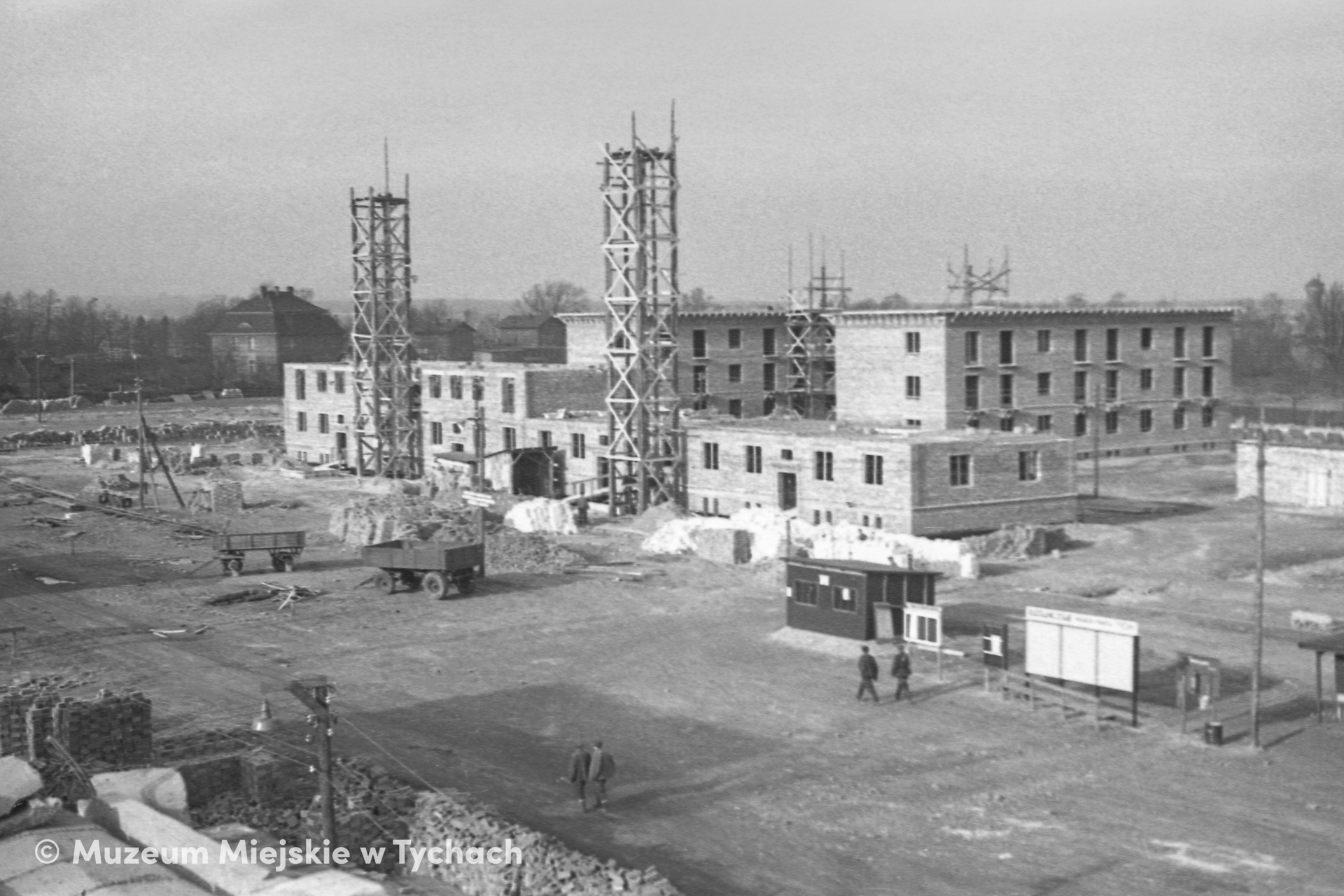 A construction site in the fields of a former manor farm near the Tychy railway station. Pictured in the foreground is a building under construction and two wooden structures (towers) for transporting building materials. These days, cranes and hoists are used for this purpose. Pictured In the background are the partly finished residential buildings at Nos 18 and 20 Lenina Street (nowadays 18 and 20 Andersa Street).