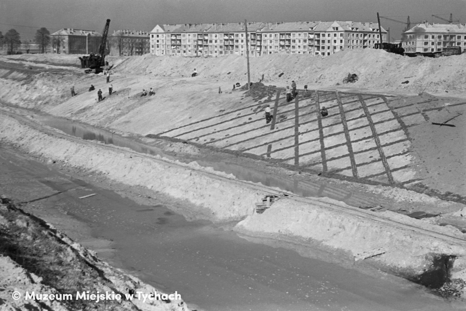 A southwestern view of a railway trench with a rail track. Work to strengthen the slope of the excavation is underway. Visible in the background are residential blocks in Czysta Street.