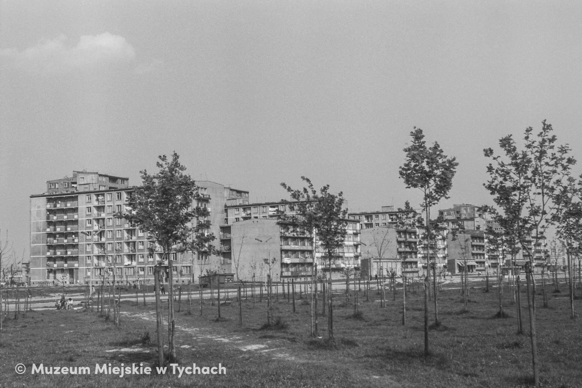 A green square between the railway trench and Jarosława Dąbrowskiego Street (now Henryka Dąbrowskiego Street). The square now bears the name of the late presidential couple Lech and Maria Kaczyński. The buildings pictured in the background are residential blocks and retail pavilions.