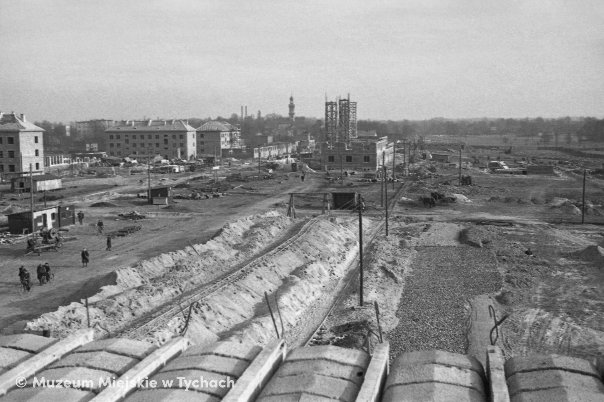 A construction site with a provisional access road, along which earthworks are underway, and which will later be converted into Wincentego Pstrowskiego Street (now Arkadowa Street) In the foreground, there is a fragment of an Ackerman floor structure of a residential block being erected at No. 8 Wincentego Pstrowskiego Street (now No. 8 Arkadowa Street), from which the photograph was taken. The background features residential blocks under construction in Włodzimierza Lenina Street (now gen. Władysława Andersa Street) and the tower of St. Mary Magdalene Church.