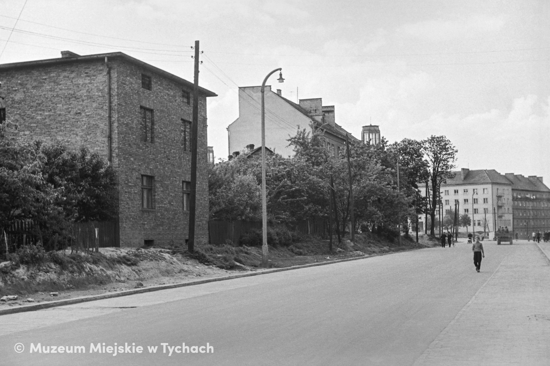 A view of a detached house demolished in the 1970s in Biblioteczna Street and residential buildings near Boleslawa Bieruta Square (now Krzysztofa Kamila Baczyńskiego Square).