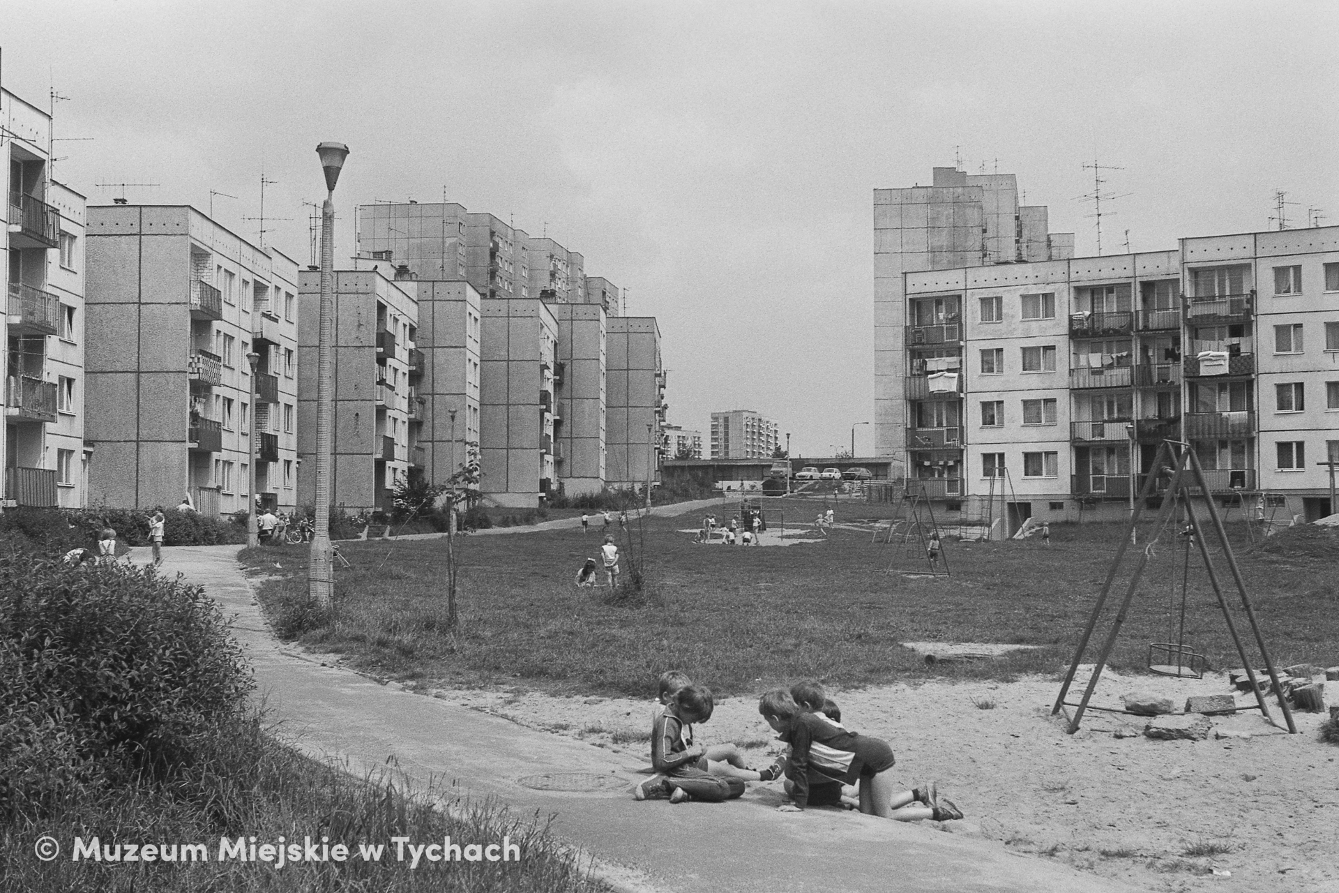 A south view of four-storey residential blocks in Lwa Tolstoja Street. Children playing in the playground located among the buildings.