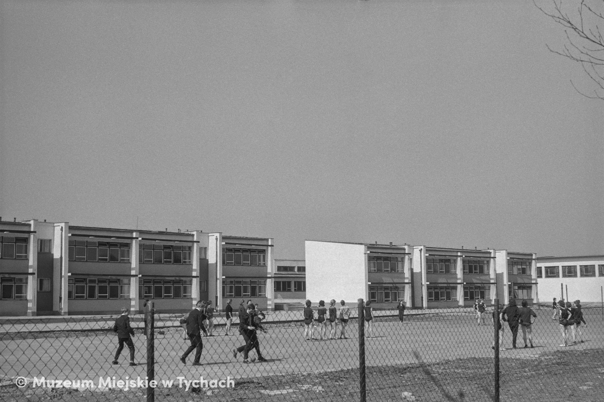 Young people on a sports ground in front of the pavilions of the Leon Kruczkowski General Secondary School No. 1. A view from the east.