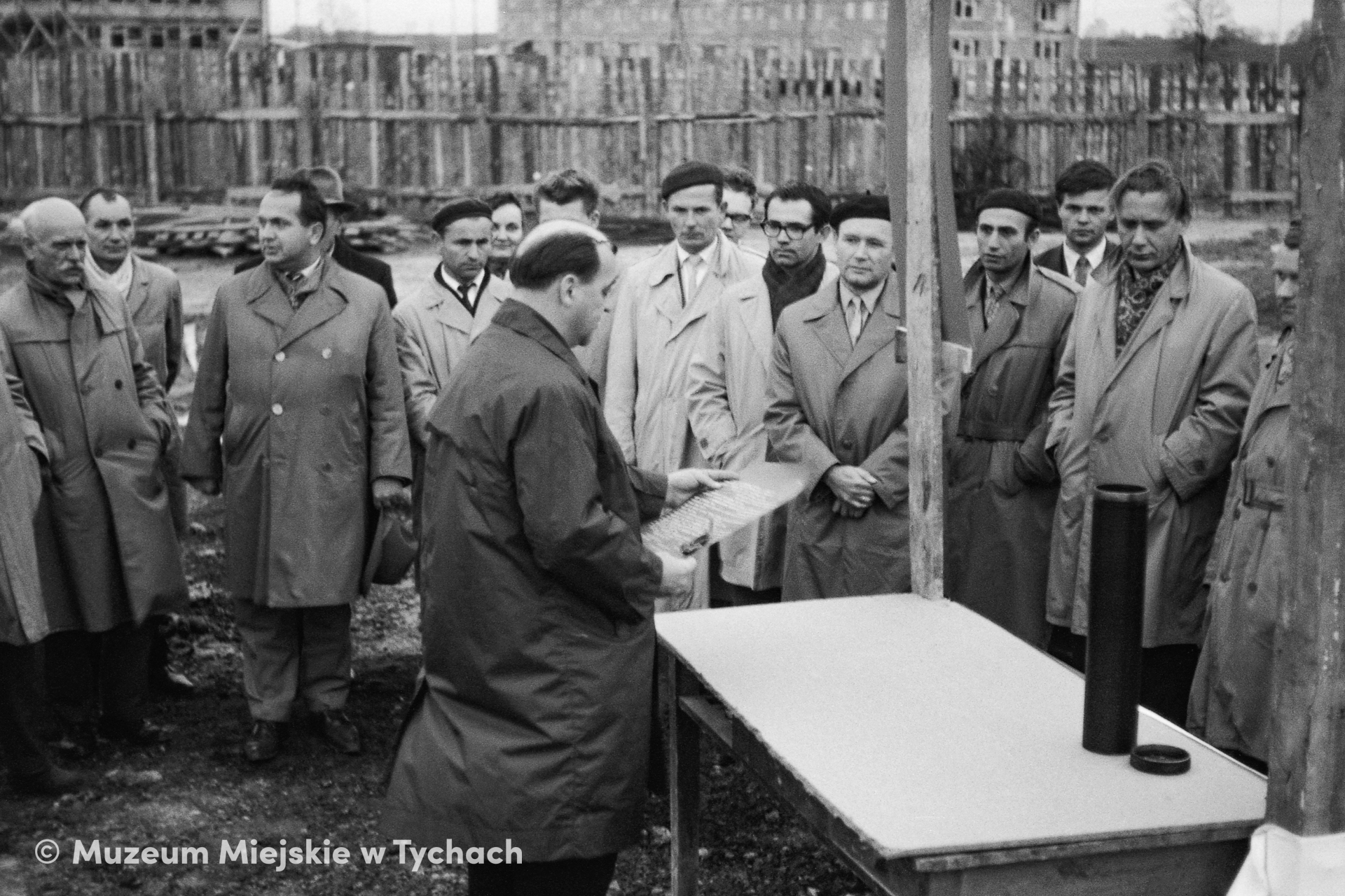 Industry officials during the ceremonial reading of the foundation act and laying the cornerstone for the construction of the Social Organisations House, intended to house, among others, the offices of the Poviat Committee of the Polish United Workers' Party (now Music School Complex).