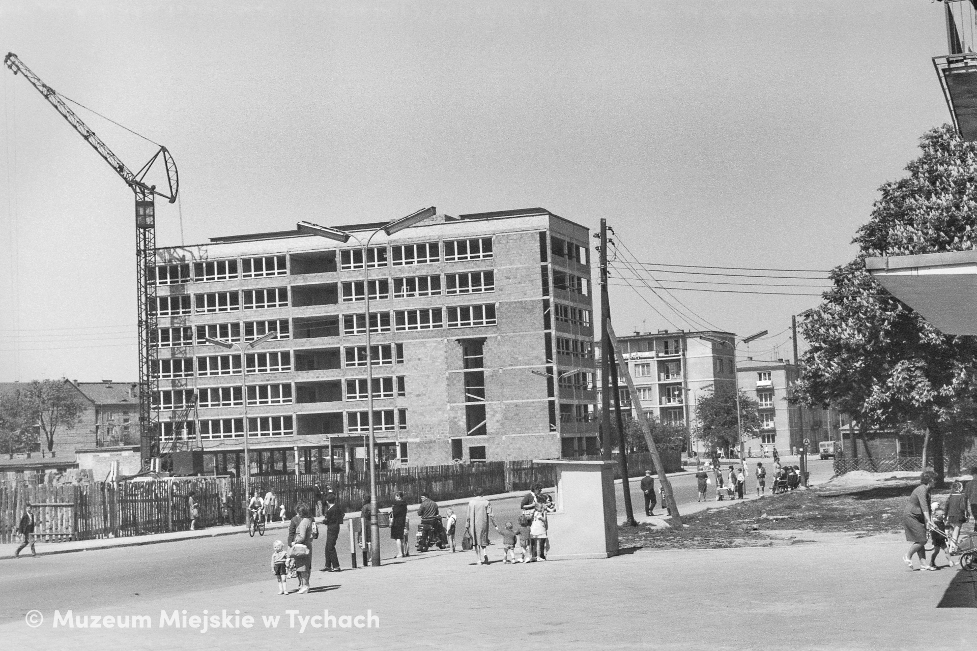 Construction of the Miastoprojekt office building, built using industrial technologies with a structural frame made of H frames and walls made of cellular concrete elements. The building is in an open shell condition. A view from Feliksa Dzierżyńskiego Street (now gen. Stefana Grota Roweckiego). On the pavement along the street residents stand by the ice cream kiosk; further back residents wait at a bus stop next to a blooming chestnut tree.