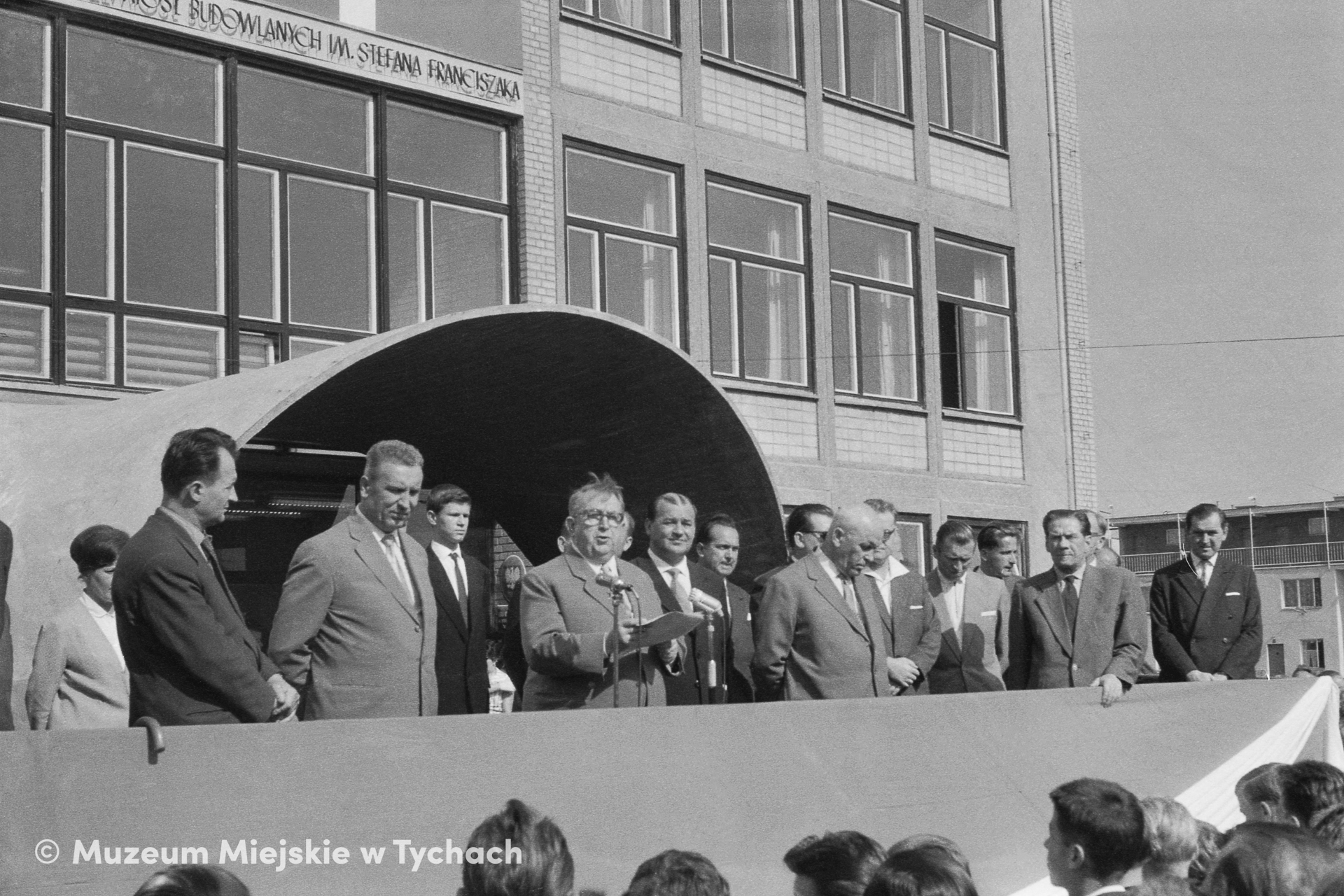 The ceremonial opening of the Stefan Franciszak Secondary School of Building Technology and the School of Building Crafts (now School Complex No. 5 in Tychy). Featured on the so-called honorary stand in front of the entrance are, among others, the Vice-Chairman of the Presidium of the Voivodeship National Council in Katowice and MP, Jerzy Ziętek (third from left) ,and the First Secretary of the Voivodeship Committee of the Polish United Workers' Party, Edward Gierek (second from left). The photo also shows a fragment of the sign with the school's name displayed on the building.