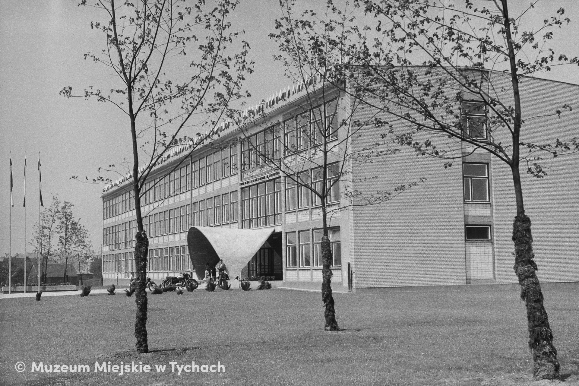 The premises of the the Stefan Franciszak Secondary School of Building Technology and the School of Building Crafts (now School Complex No. 5 in Tychy) with a distinctive shell roof over the main entrance to the building. On the left, a fragment of old farm architecture.