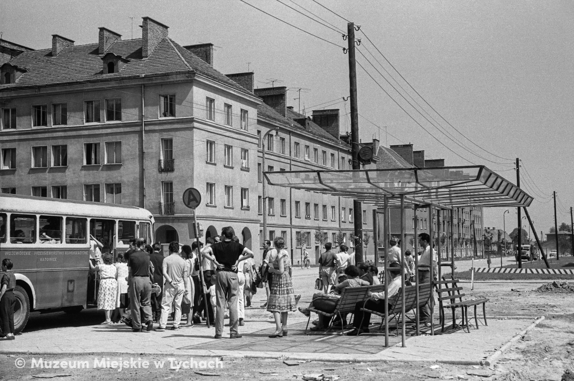 A WPK public transport stop in Budowlanych Street with a distinctive sign in the shape of a round shield with the capital letter A. Residents in front of the entrance to an Ikarus 60 bus. Residential blocks are visibla in the background.
