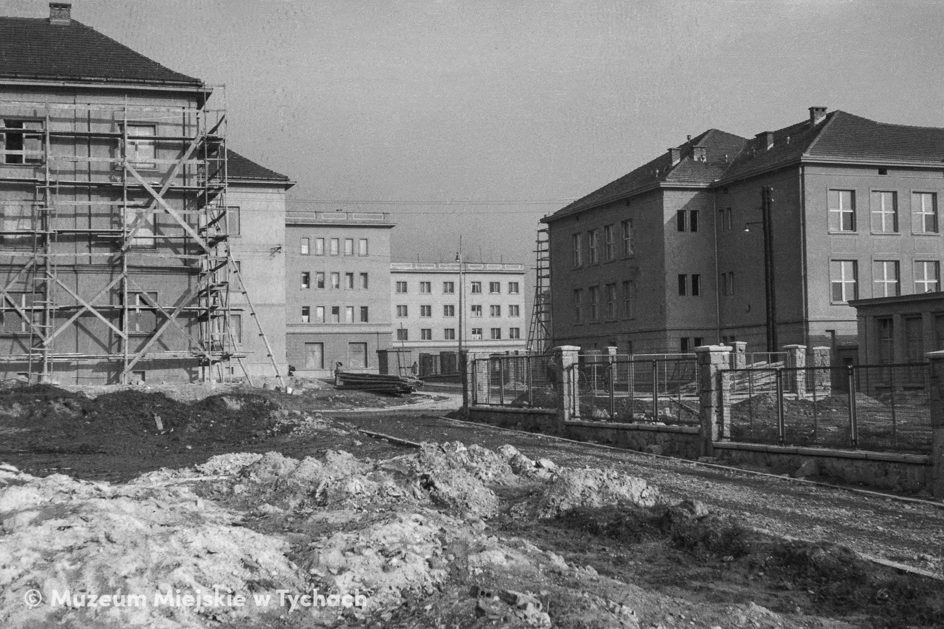 Residential blocks and a fragment of Primary School No. 3 in Wojska Polskiego Street. In front of them one can see a disorderly area and remnants of a construction site.