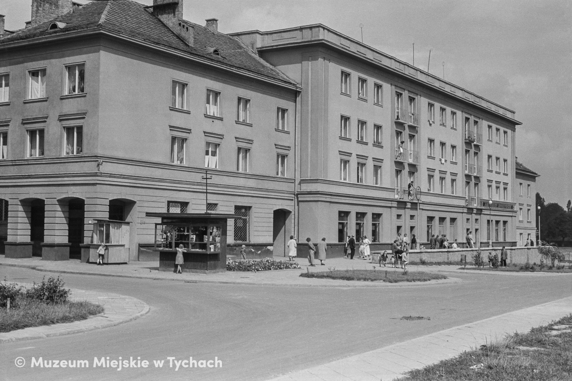 Residential blocks located at the corner of Wincentego Pstrowskiego Street (now Arkadowa Street) and Henryka Arctowskiego Street, with a 'Ruch' newsagent's and an ice cream kiosk in front of them. Residents stand in front of the ground-floor shop windows. A view from Arctowskiego Street.