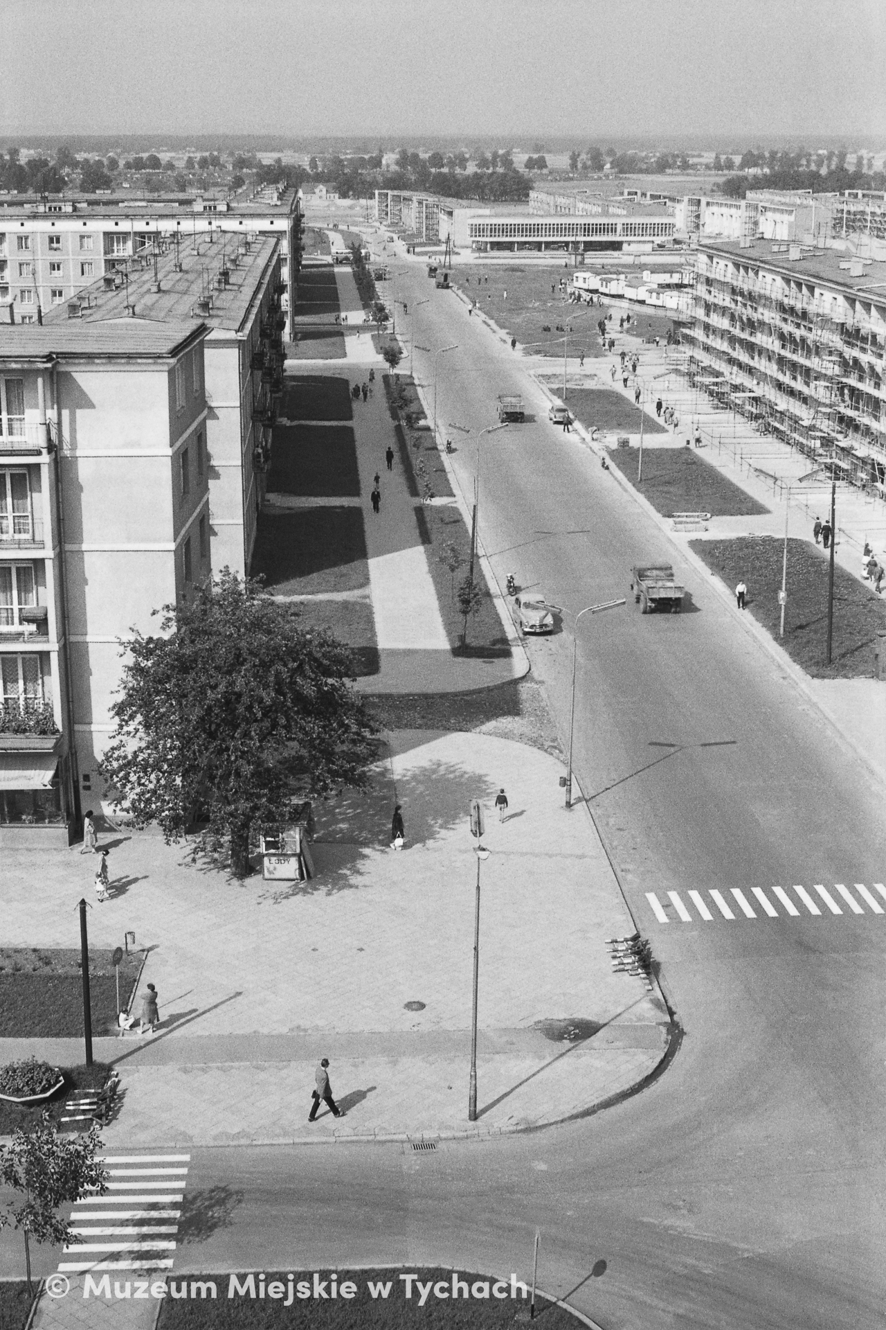 A bird's eye view of one of Tychy's main thoroughfares, Feliksa Dzierżyńskiego Street (now Stefana Grota Roweckiego Street) and its architecture. On the ground floors of the buildings there are retail and service shops. In the background, on the right, the building of the NOT Mining Club is located.