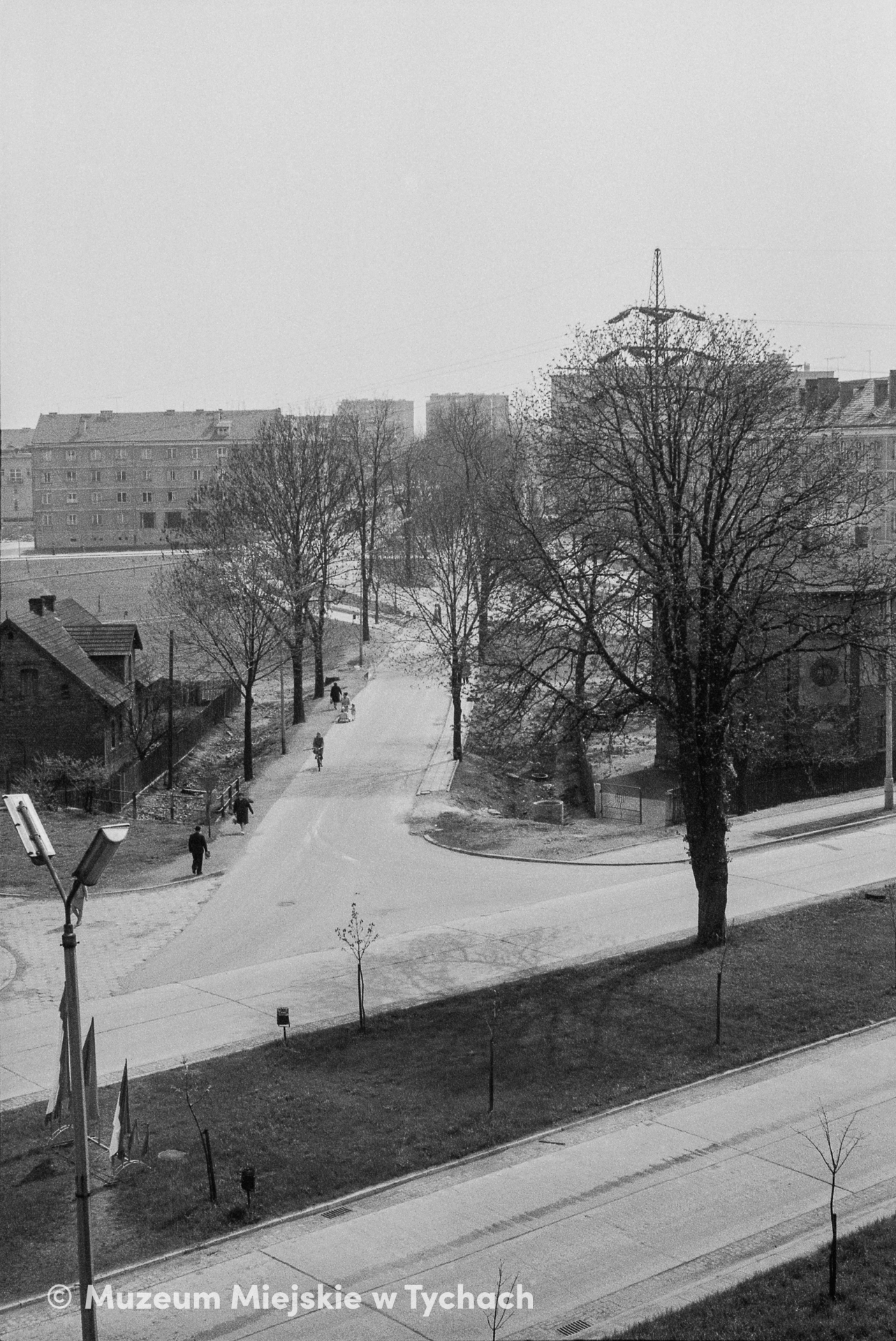 The junction of Bielska Avenue with the old road to Paprocany, running among old family houses. Shown in the background is a fragment of Niedźwiadków Park, the buildings of housing estates E and C and a section of a former road connecting with the two-lane Paprocańska Street (Rewolucji Październikowej Avenue from 1968, now Niepodległości Avenue).