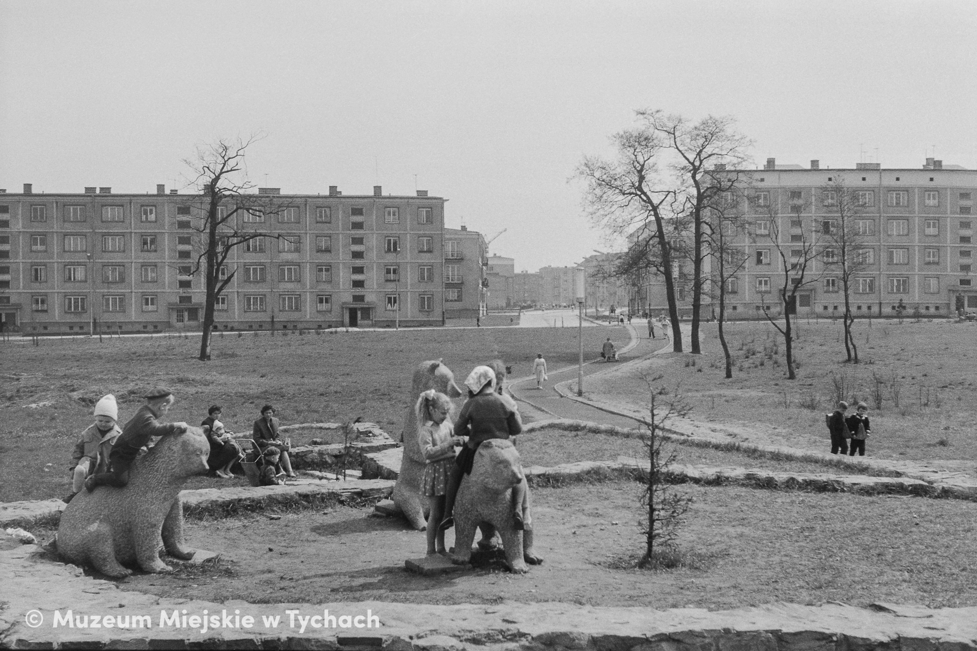 Children have fun at the sculptures of bears by Augustyn Dyrda in Niedzwiadków Square (currently Niedzwiadków Park [Bear-cub Park]). In the background, low-rise residential buildings in Edisona Street. The photograph was taken around 1963.