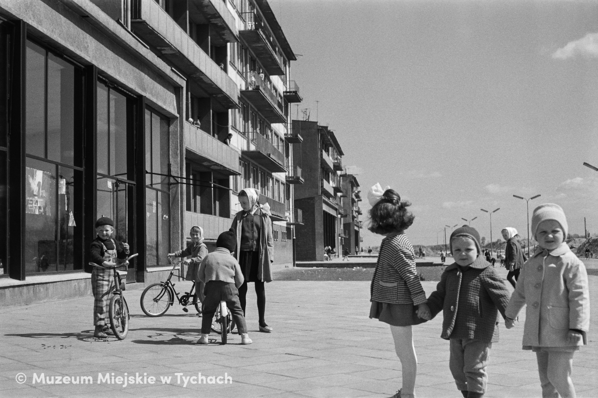 Children playing in one of the pavilions in Housing Estate D1's Jarosława Dąbrowskiego Street (now Henryka Dąbrowskiego Street) along the railway trench.
