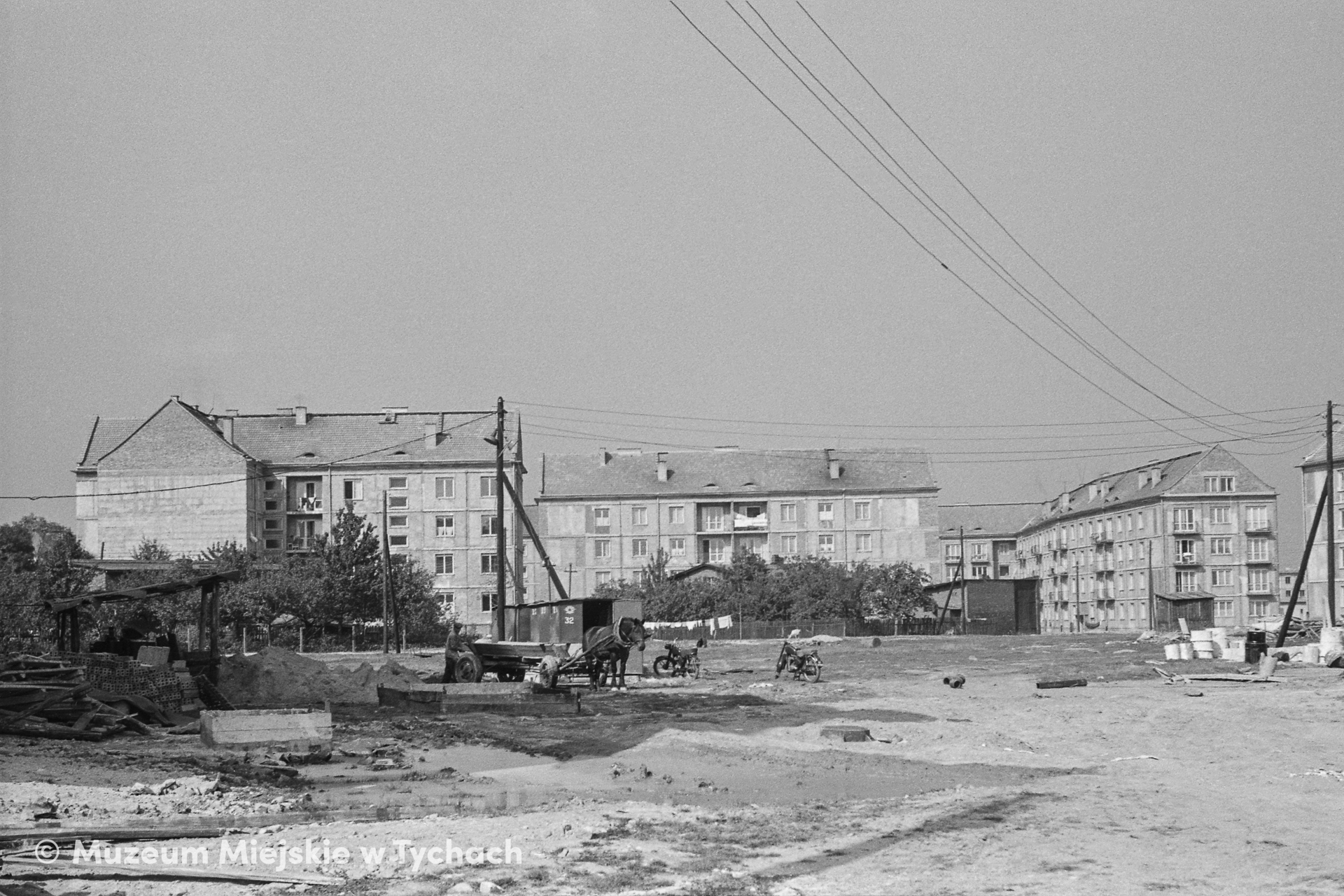 A view of three-storey blocks of flats and old rural buildings in Housing Estate E. Pictured in a farmyard is a horse harnessed to a cart with a man standing next to it, and two motorcycles parked nearby.
