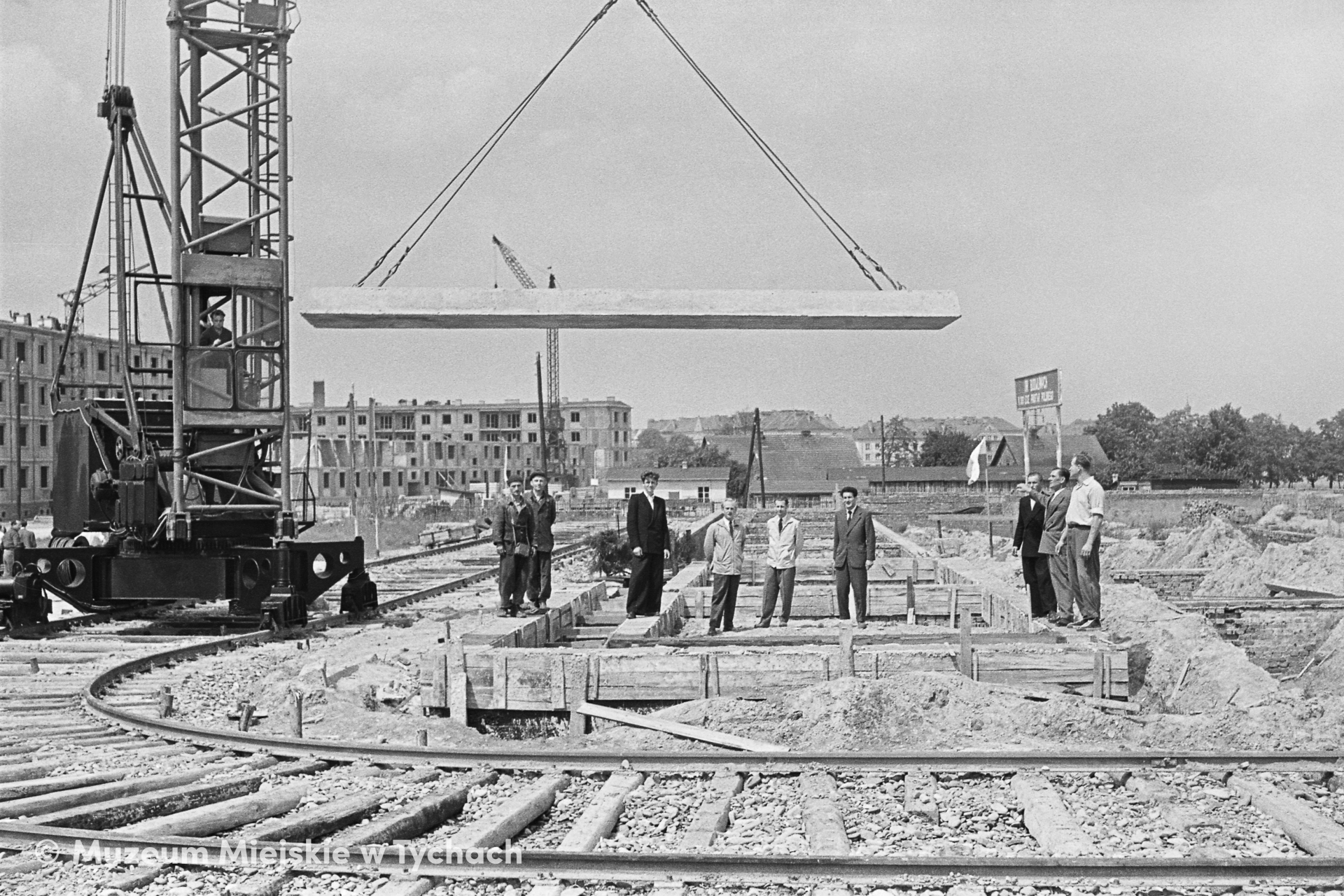 Employees on the construction site of the Stefan Franciszak Secondary School of Building Technology and the School of Building Crafts. Also pictured is a banner on the right and some old rural buildings in the background.