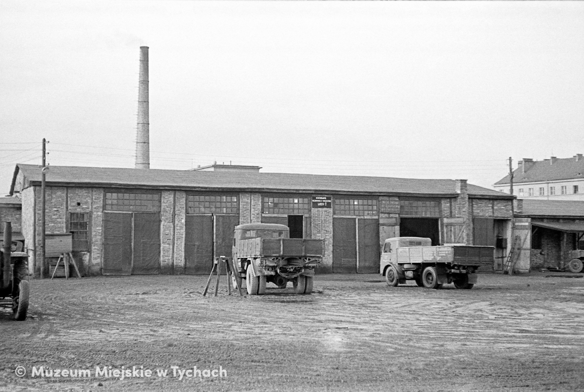 The Transport Base premises. A garage for Star lorries and URSUS tractors, including those standing in the square in front of the building. URSUS C-45 tractors and Star W14, 20 and 21 lorries were vehicles of choice f in the building industry.