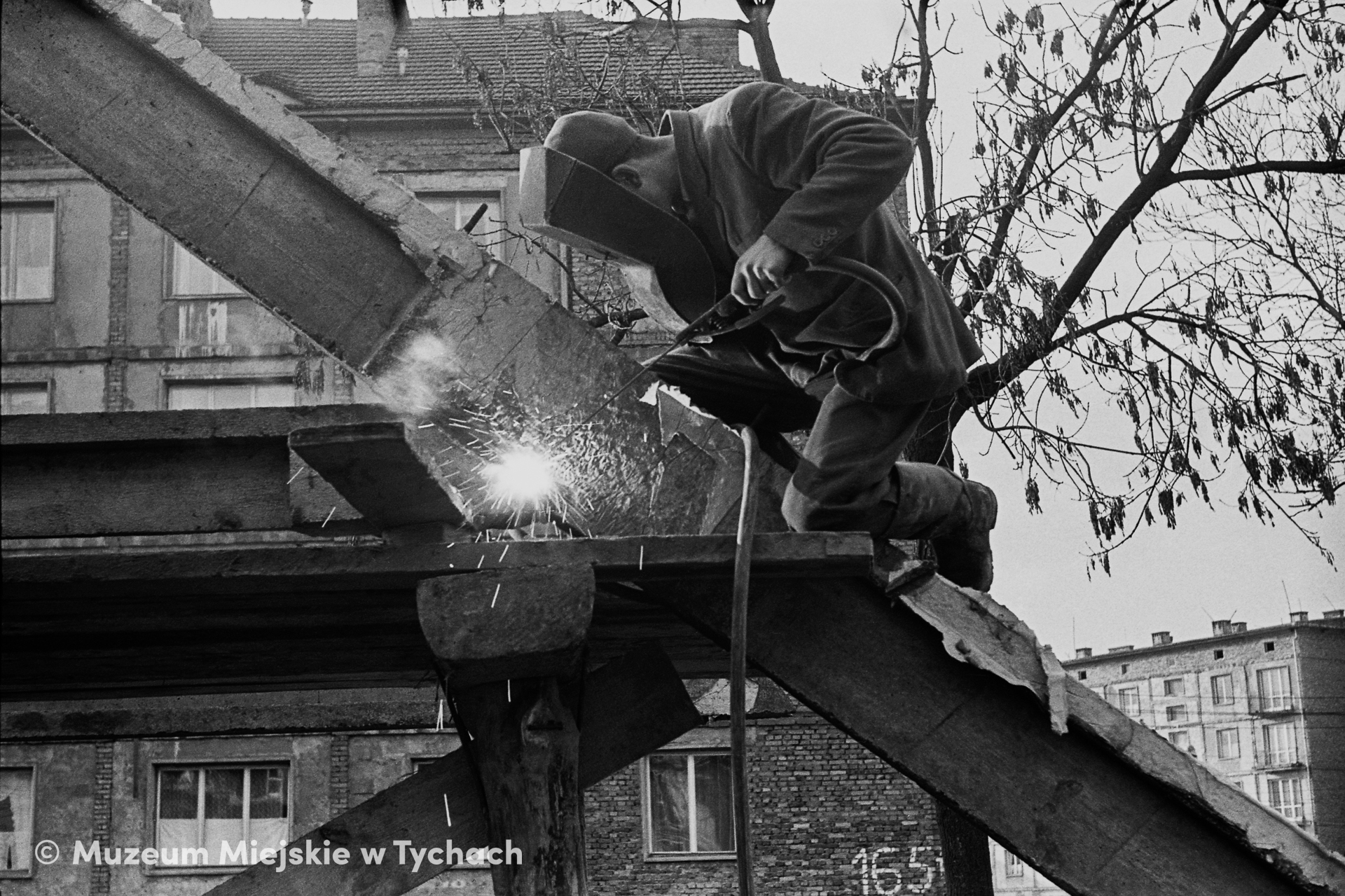 Welding of metal joints of the installed roof structure of a residential building.