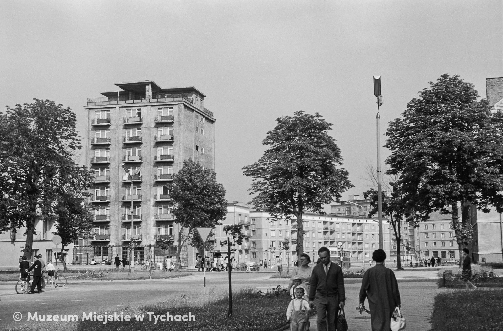 The intersection of Bielska Avenue with Stefana Czarnieckiego and Cyganerii Streets. Two women and a man with two little boys walk on the pavement in Czarnieckiego Street. Pictured behind the crossroads is a stall with a group of women around it, and , in the background, residential blocks in Cyganerii Street.