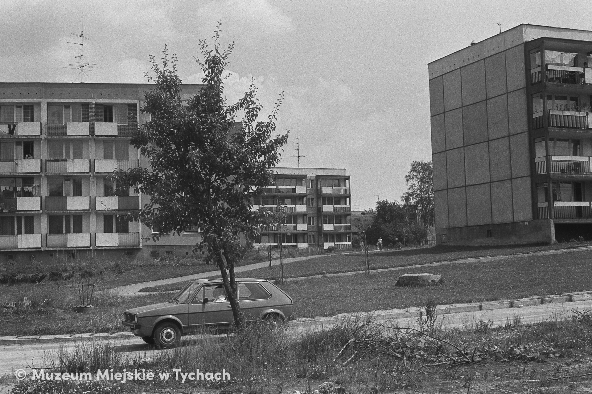 Residential blocks visible from Władysława Sikorskiego Street. A Volkswagen Golf 1 passenger car passes along the street.