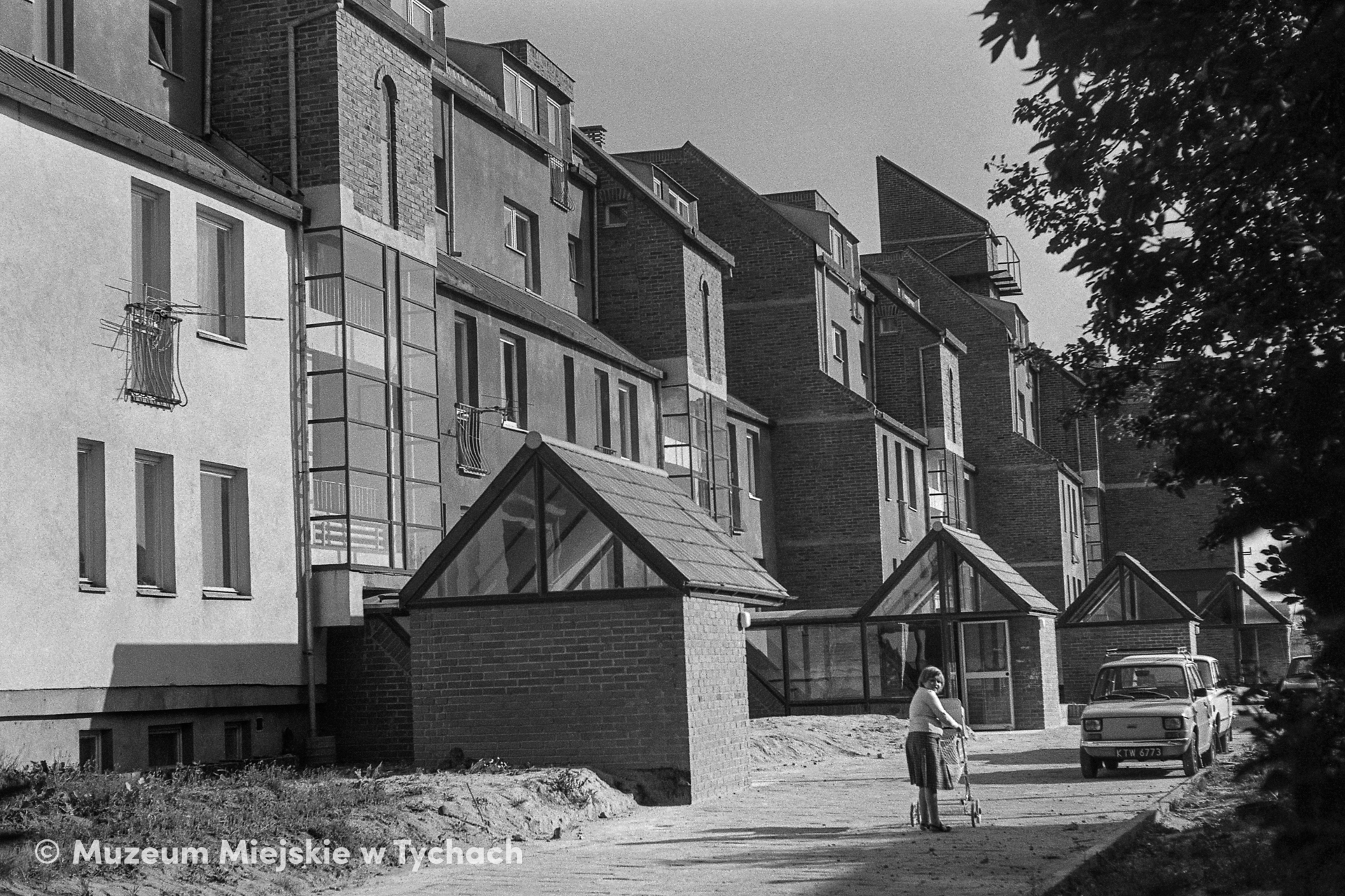 A fragment of a low-rise residential block and the road passing in front of it in housing estate H7. A woman with a pram stands on the roadway; visible behind her is a Fiat 126p. The general design of Housing Estate H was developed by Janusz Włodarczyk in collaboration with Hanna Adamczewska-Wejchert and Kazimierz Wejchert.