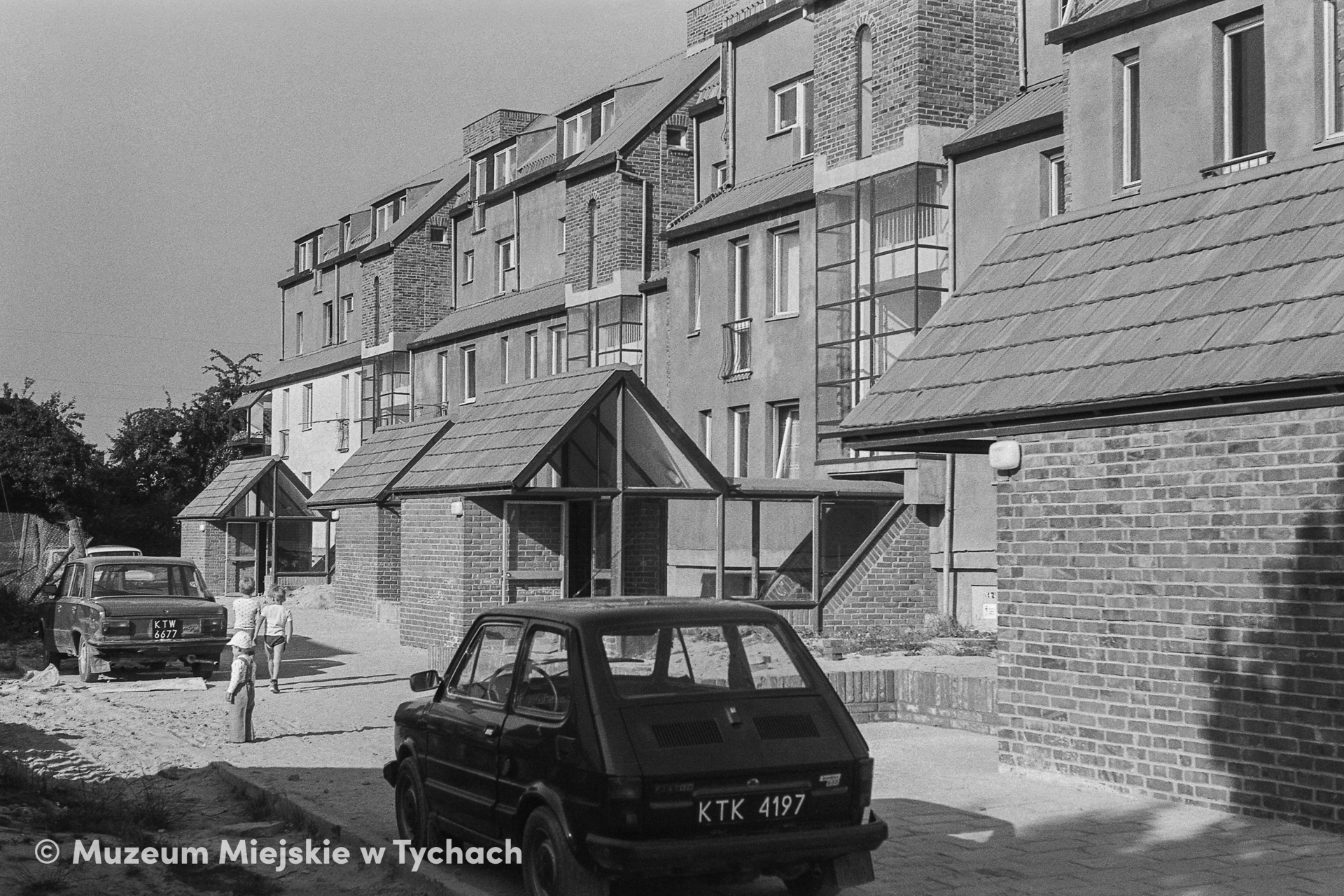 A fragment of a low-rise residential block in Housing Estate H7. Two cars are parked in front of the building (a Fiat 126p in the foreground), further back, t three children play on the pavement. The general design of Housing Estate H was developed by Janusz Włodarczyk in collaboration with Hanna Adamczewska-Wejchert and Kazimierz Wejchert.