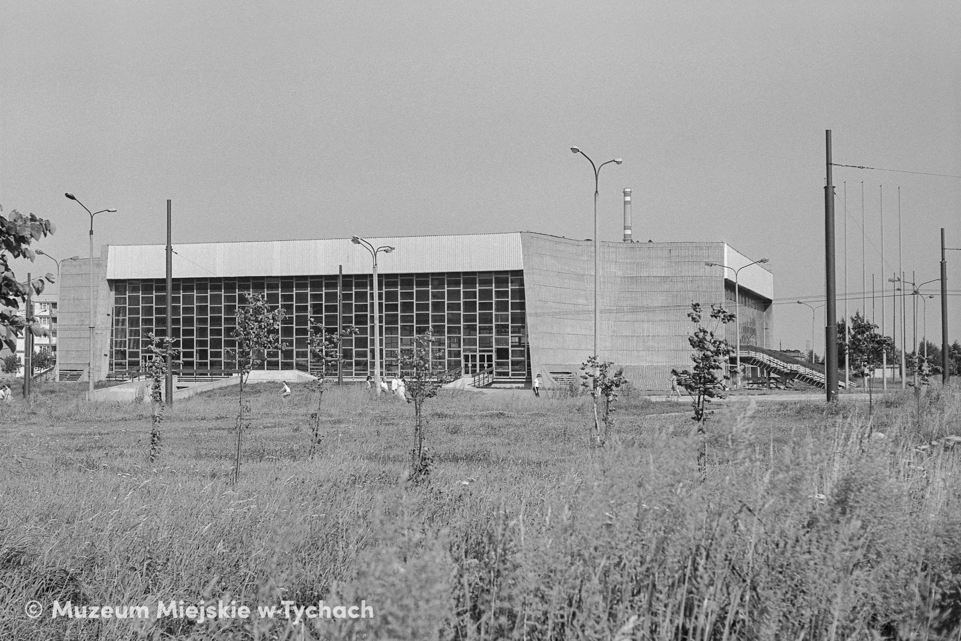 An artificial ice rink (now Stadion Zimowy Tychy [Tychy Winter Stadium]) in Housing Estate G; a view from Małgorzaty Fornalskiej Street (now kardynała Stefana Wyszyńskiego Street), from an alleyway along the railway trench.