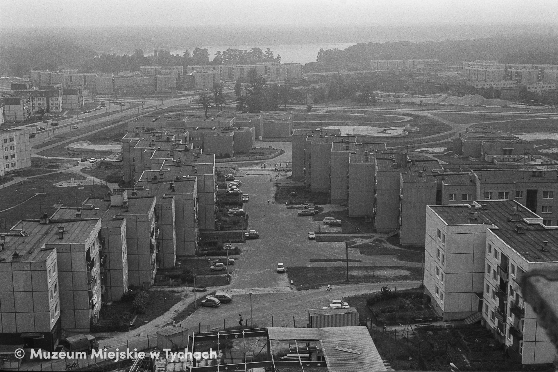 A view from a high-rise block in Housing Estate T towards the south. Three-storey residential buildings in Lwa Tolstoja Street. In the background there is Primary School No. 7 with fenced premises adjacent to Sikorskiego Street and the intersection with Iwana Koniewa Street (now Armii Krajowej). Visible behind the crossroads are the buildings of Housing Estate W and a fragment of Lake Paprocany.