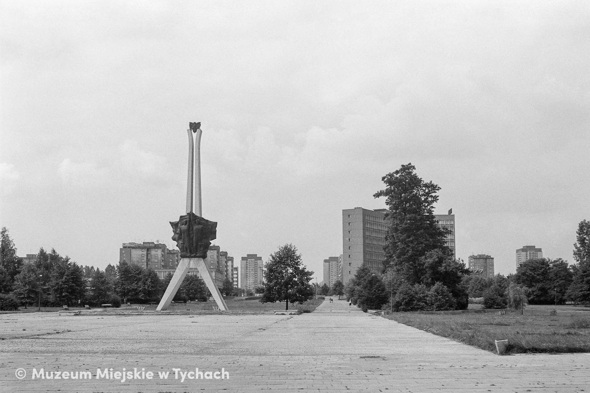 The Monument to Struggle and Labour (commonly known as the Giraffe) in Municipal Park. In the background you can see the building of the Municipal National Council (now Tychy City Hall) and residential blocks in housing estate D.