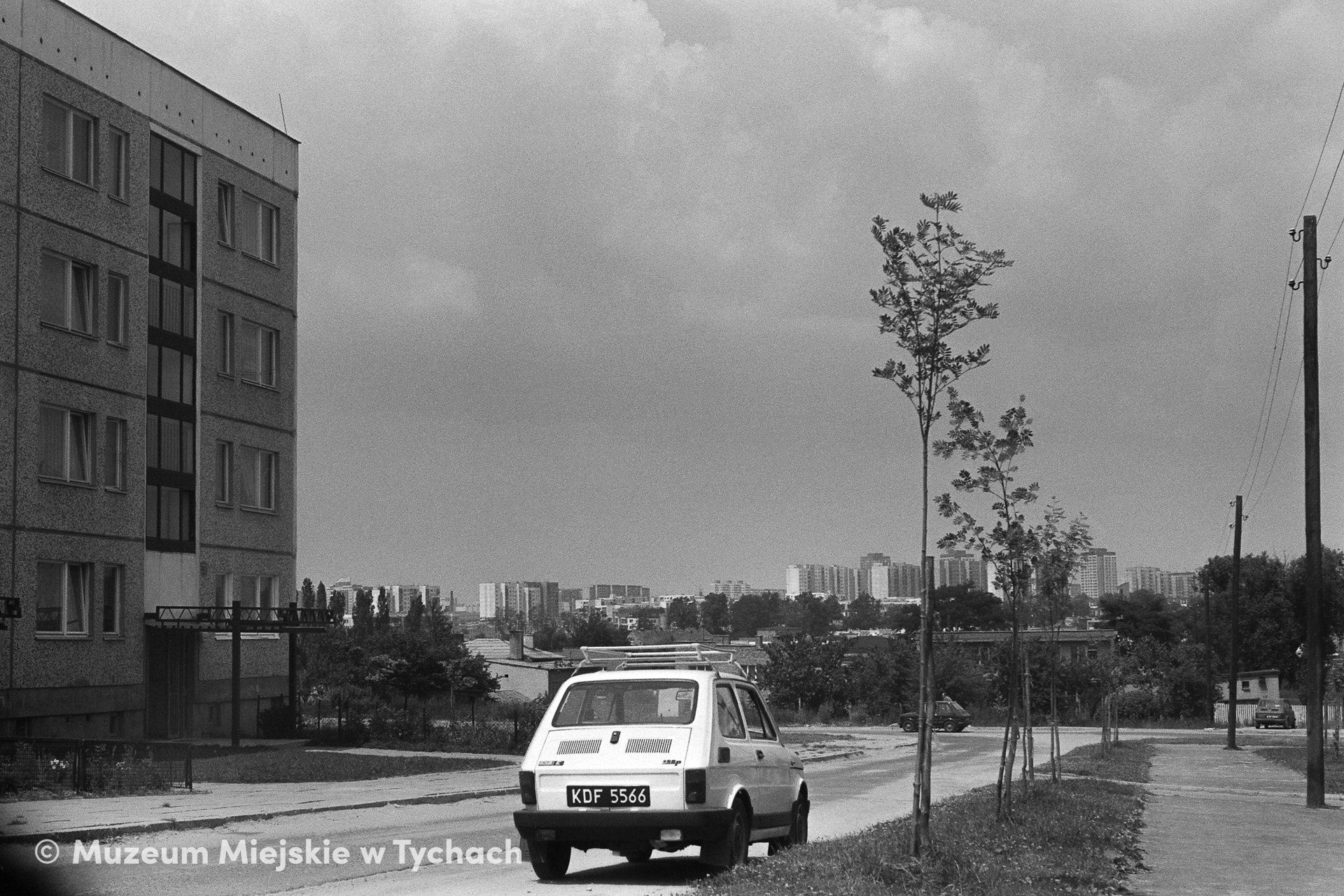 A residential block at the confluence of Rudolfa Zaręby and Alfonsa Zgrzebnioka Streets. In front of the building there is a Fiat 126p passenger car. Some o fthe city's housing estates are visible in the far background.