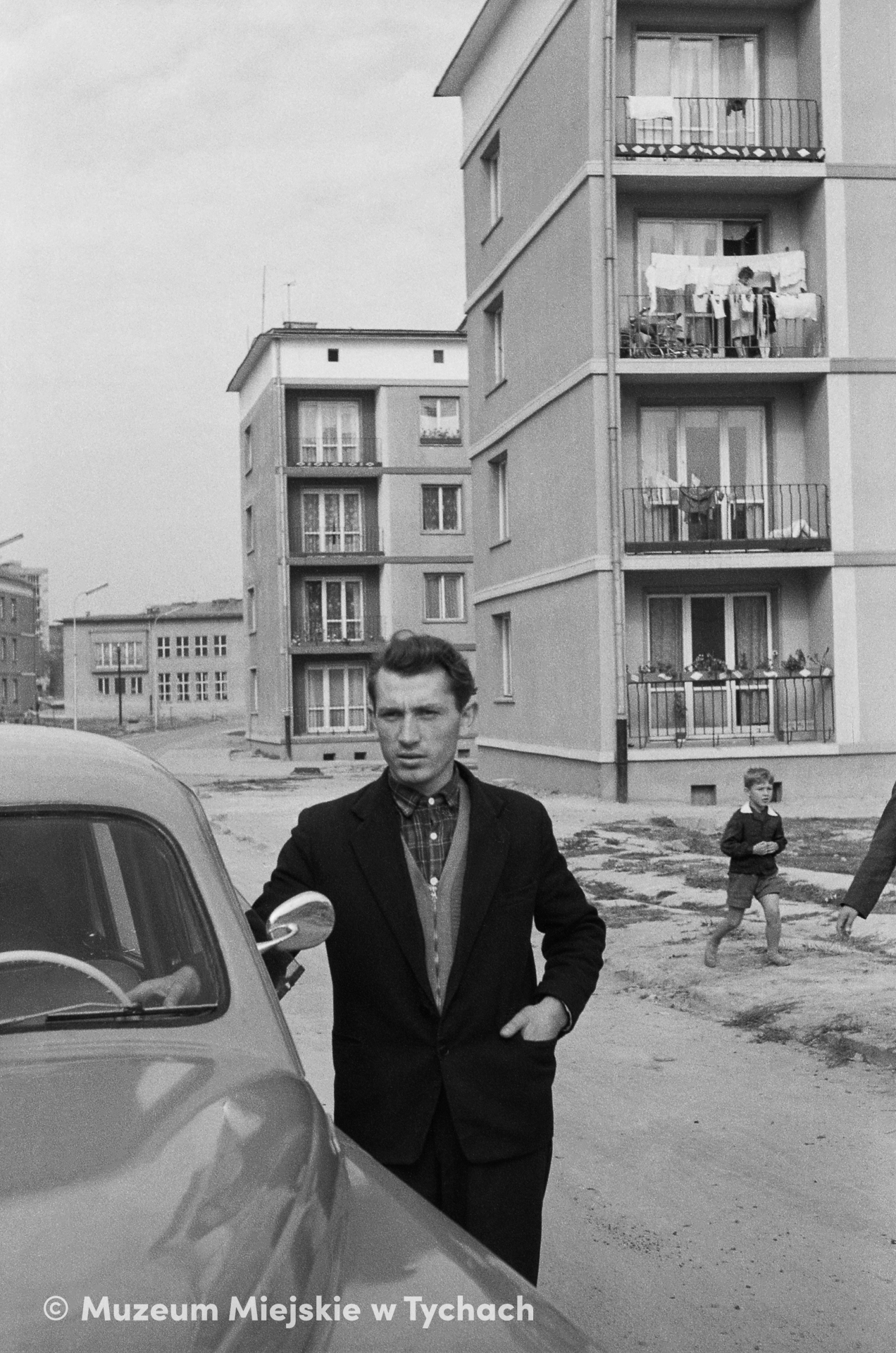An employee of the Tychy Municipal Construction Company at a passenger car parked in Marii Curie-Skłodowskiej Street during the cornerstone ceremony for the construction of a residential block for the company's employees. The construction of the building was funded with money obtained by reducing the cost of facilities built under the State Investment Plan for 1961. Pictured in the background is a fragment of Primary School No. 11.
