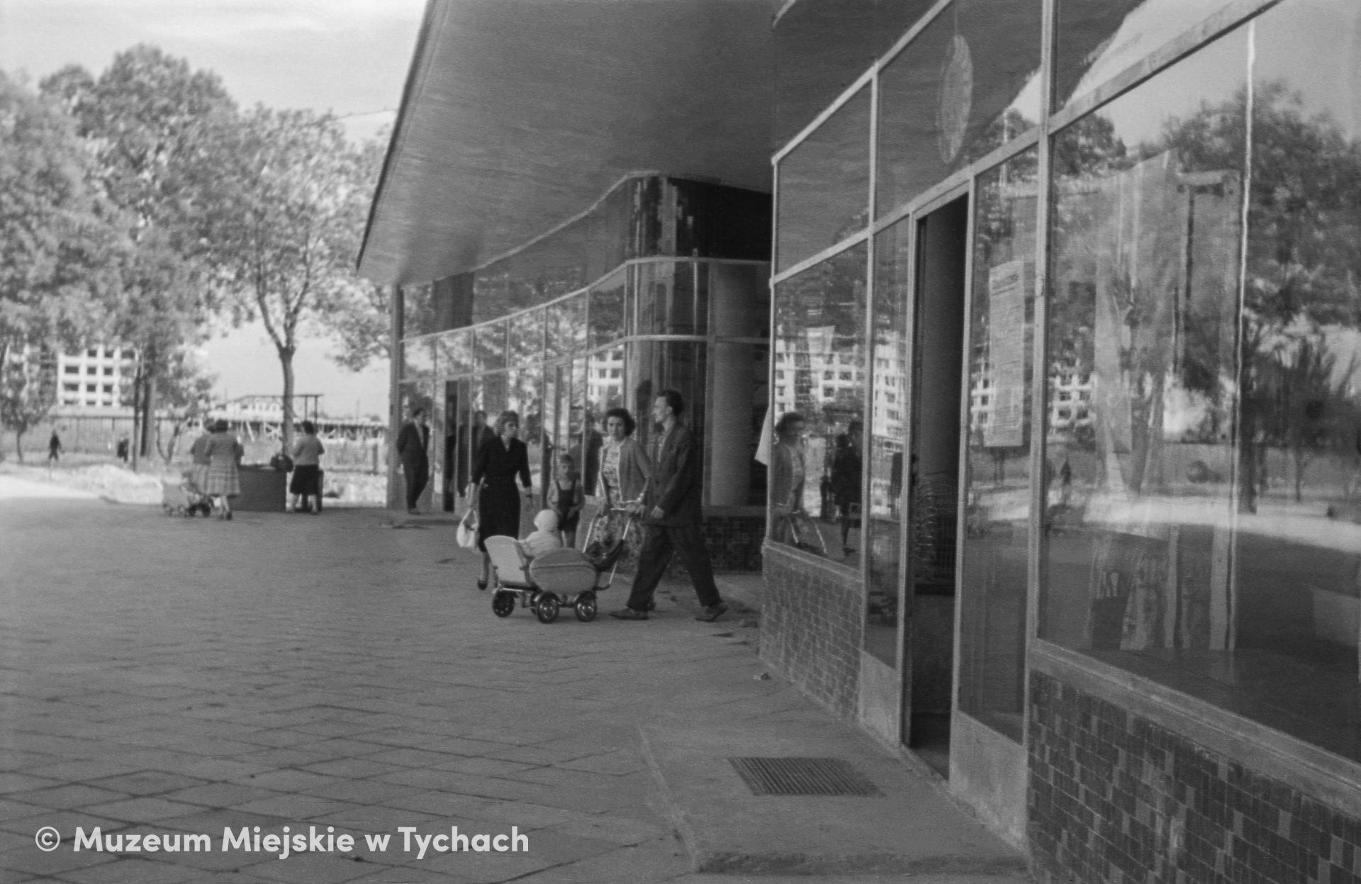 Residents walk in front of the glass façade with entrances to the shops. The shopping pavilion adjacent to the gable wall of the residential block housed a passage leading to Cyganerii Street. The free space on the other side of the pavilion will accommodate the Miastoprojekt office building, erected between 1965 and 1966. A view from the northwest.