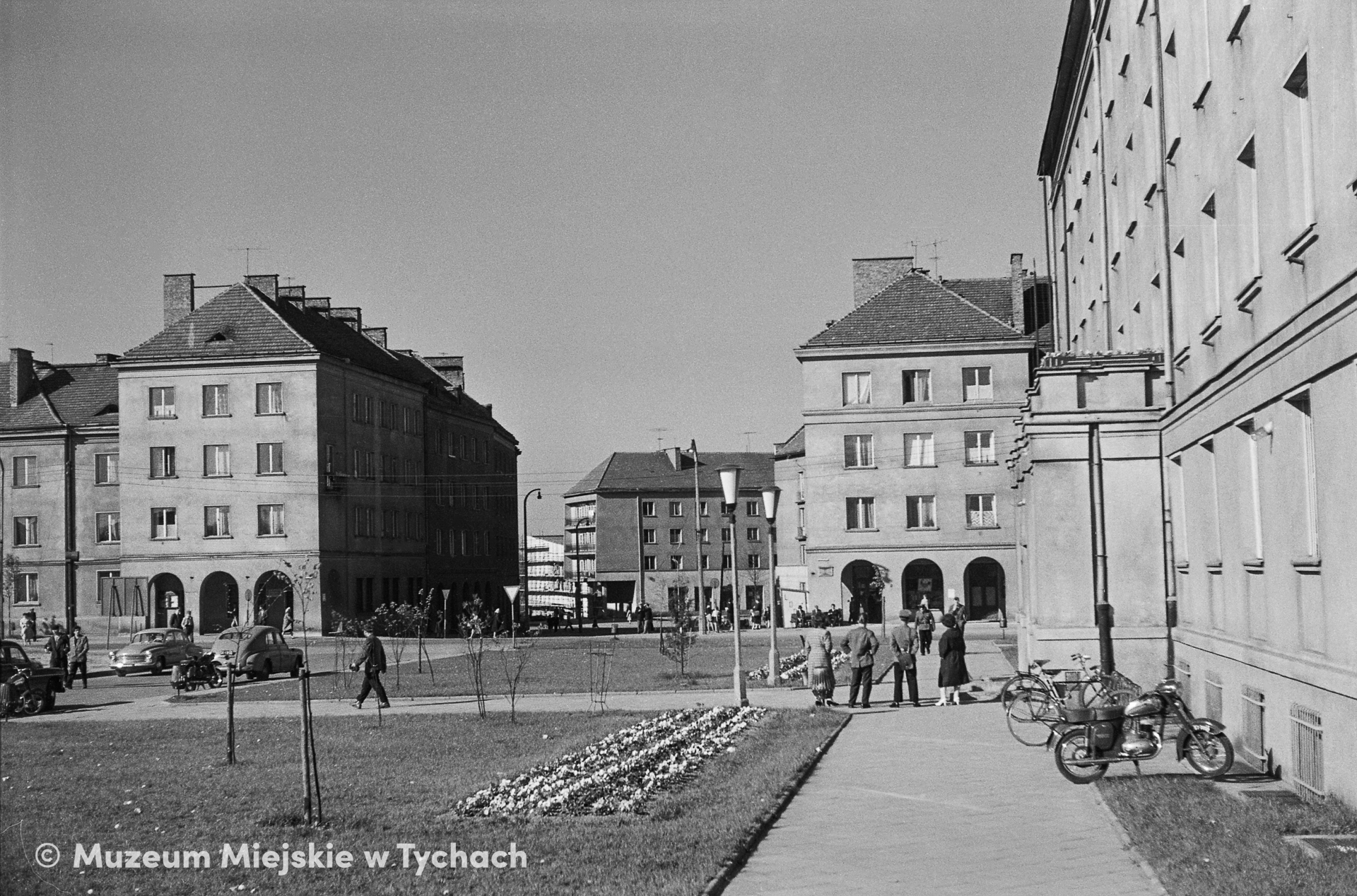 Residential blocks near the intersection of Budowlanych Street and Mariana Buczka Street (currently Krzysztofa Kamila Bocheńskiego). Shown on the right is the front wall of the building of the Presidium of the Municipal National Council in Begonii Street, viewed from the south. The construction of the Andromeda cinema is underway in the background.