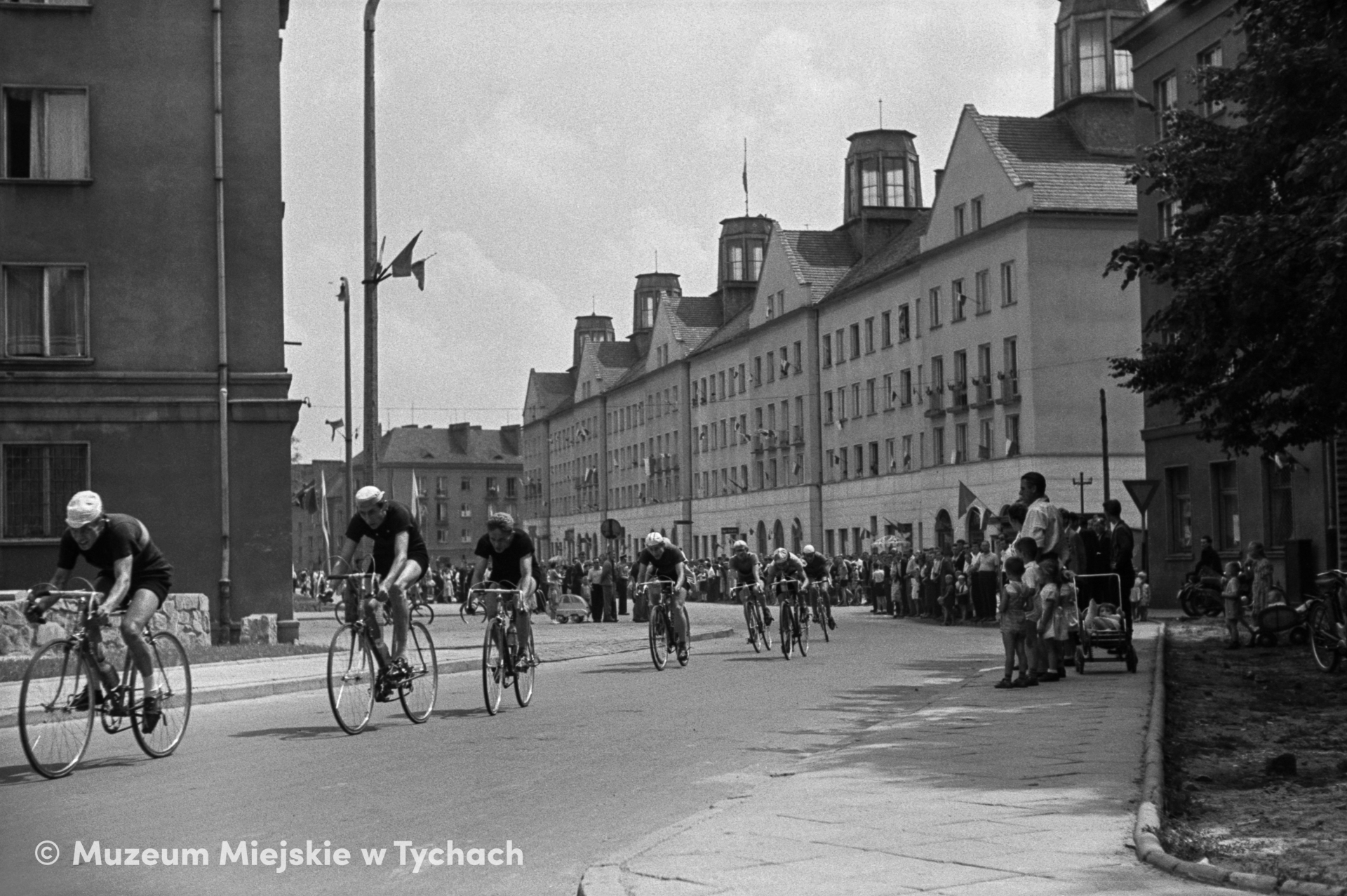A cycling race along the streets of Housing Estate B. Cyclists leave Boleslawa Bieruta Square (now Krzysztofa Kamila Baczyńskiego Square).