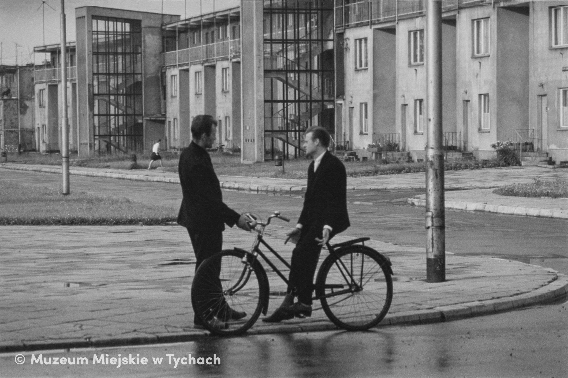 A chat between men standing on the pavement in front of terrace snd gallery blocks near Elfów Street.