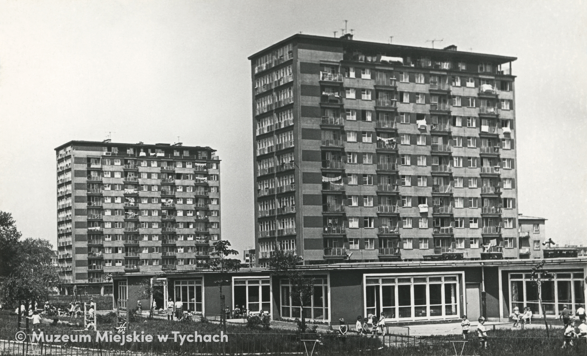 Children play in the garden next to the nursery school pavilion now the Rehabilitation, Training and Education Centre). The photo shows the nursery school building and adjacent residential blocks. The street in which the building stands was originally called Paprocańska Street, (Rewolucji Październikowej from 1968 to 1989, now Niepodległości Avenue).