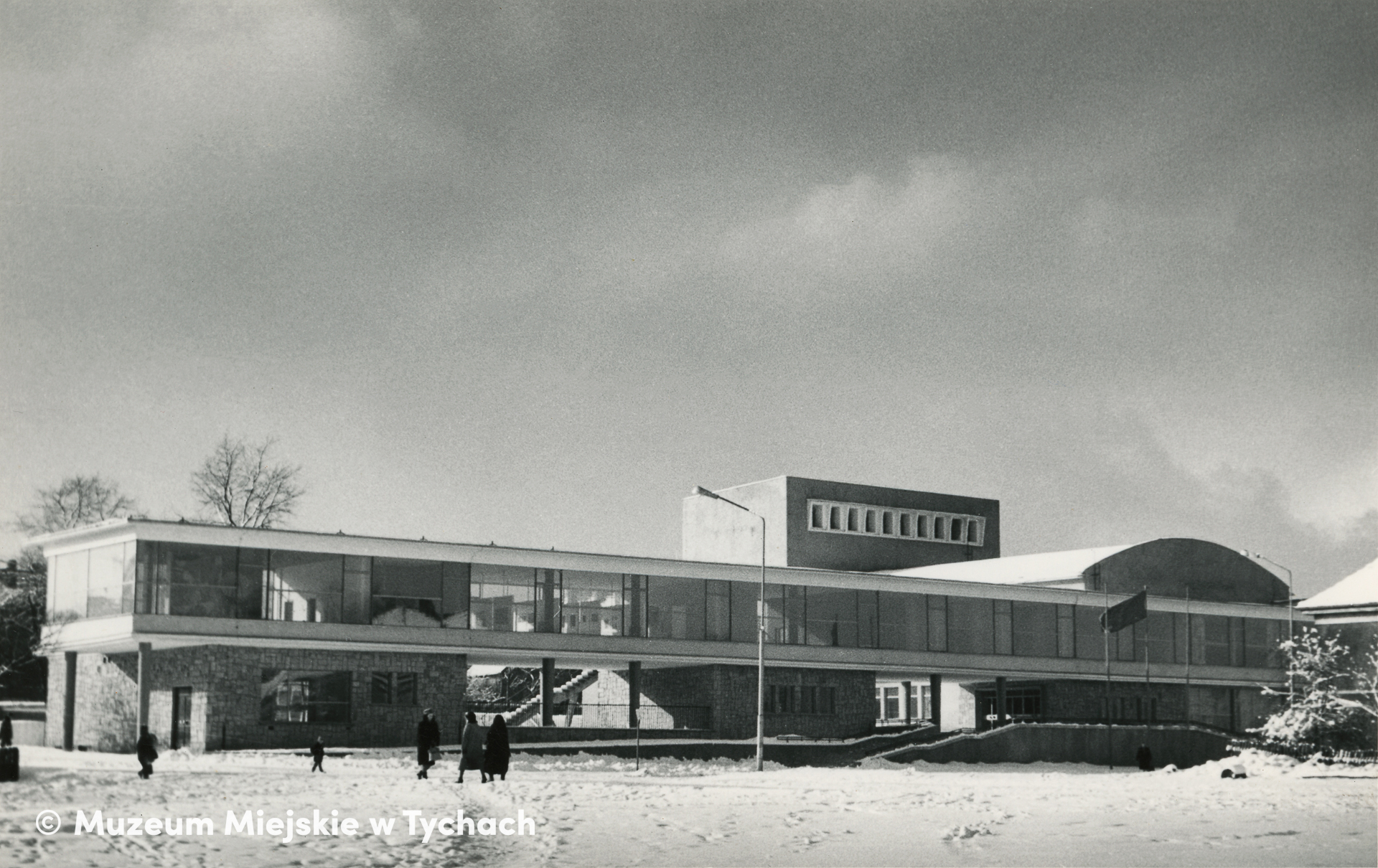 A front view of Teatr Mały, a low, glazed building, supported by columns in the central part, forming arcades with a passage to the courtyard. The auditorium and the stage are built into the right wing of the glazed part of the building; the left wing housed Teatralna Café.