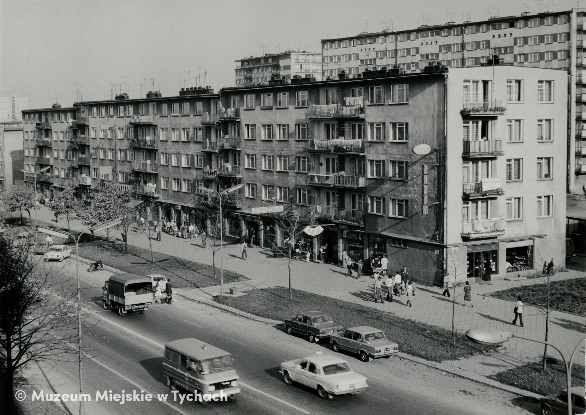 An elevated view of a four-storey building in Feliksa Dzierżyńskiego Street with retail and service units on the ground floor. Visible behind the building there is a fragment of Housing Estate D.