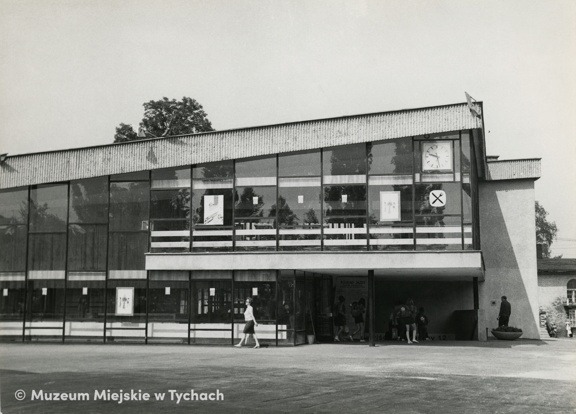 A front view of a fragment of the Tychy railway station building with the passageway to the platforms.