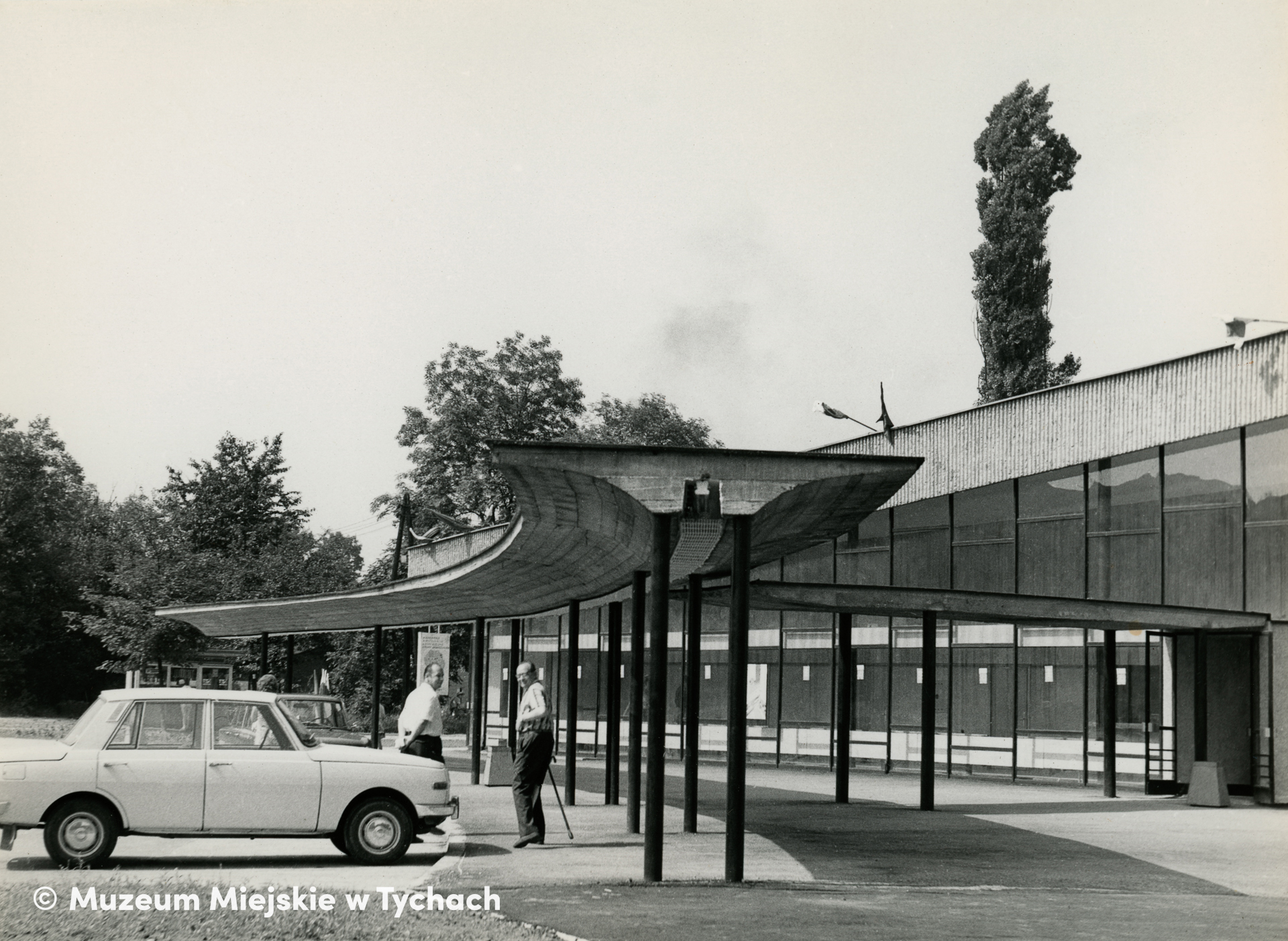 A fragment of a railway station building. A rounded roof in front of the entrance to the building provided shelter for passengers at the public transport stop.