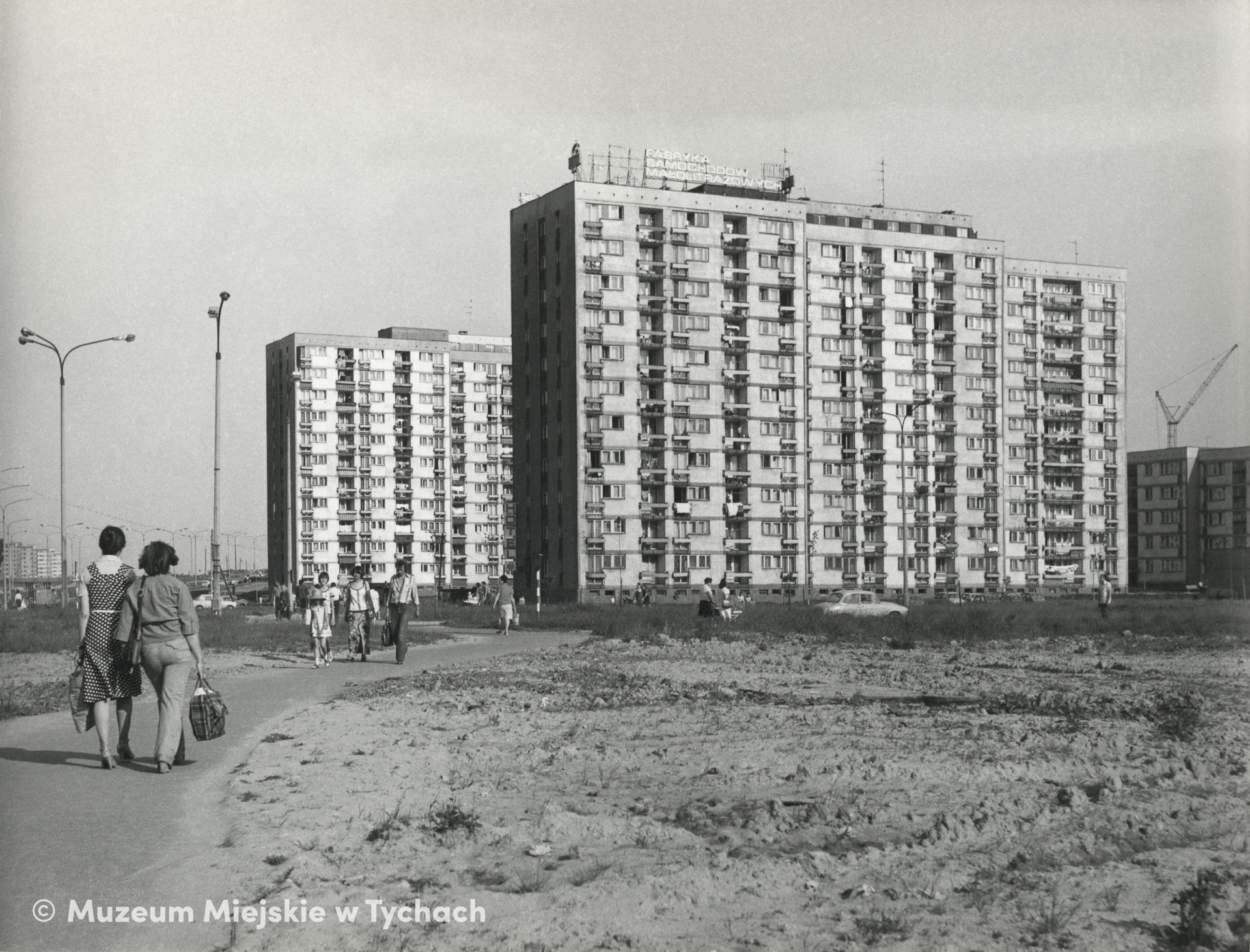 Residents walk along the pavement towards two ten-storey residential blocks. The roof of one of the buildings bears a sign saying 'FABRYKA SAMOCHODÓW MŁOLITRAŻOWYCH' (COMPACT CAR COMPANY) and neon signs with the company's logo (the building was originally used as a hotel for the employees of the plant). Shown on the right is a fragment of a four-storey block of flats a crane behind it.