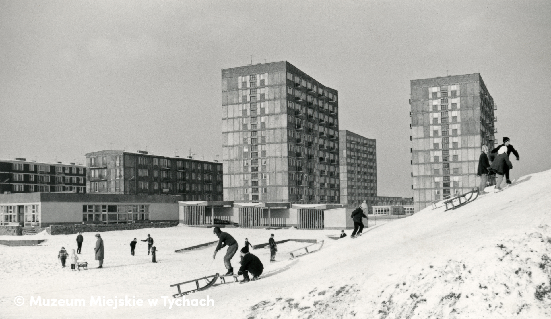 Children sled in the Jordan garden next to the pavilion of the children's community centre (currently the Youth Culture Centre No. 2). Visible behind it are high-rise residential blocks in housing estate E's Elfów street.